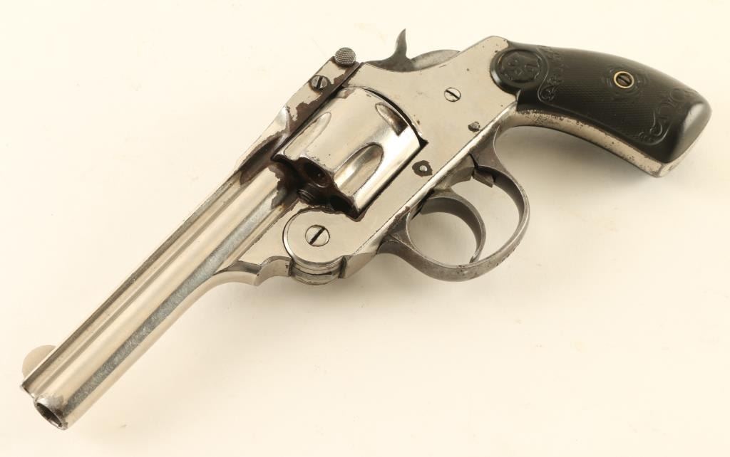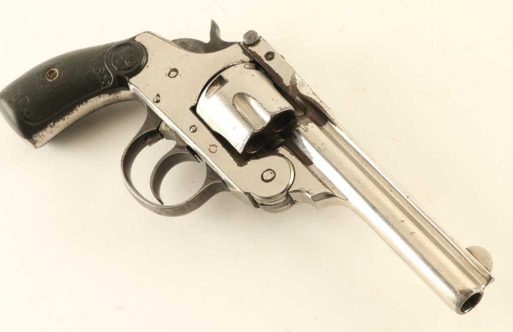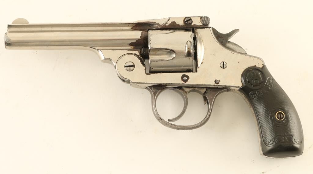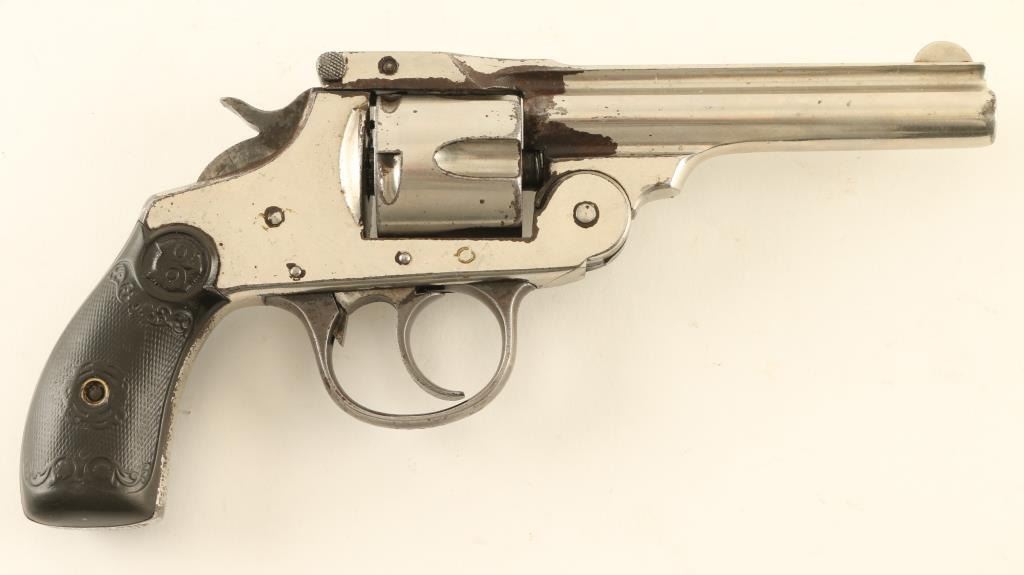 SN: M17627 'Second Model' 1896-1908 double/sing action break top revolver. Features nickel finish, blued triggerguard, checkered black gutta percha grips, 4" barrel, fixed sights. Bore is good condition with strong rifling, visible pitting. Charge holes are good condition. Retains 60% finish, turning brown around breech and bottom of top strap, near trigger guard, neat hammer, with peeling at edges. grips are good condition. Cylinder spins freely with trigger at rest. Action operates fairly smoothly, with slightly loose lock-up. Condition is NRA Poor *** C&R Firearm ***
