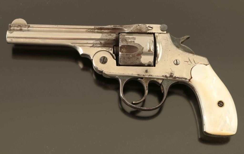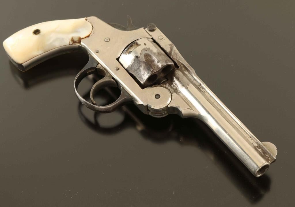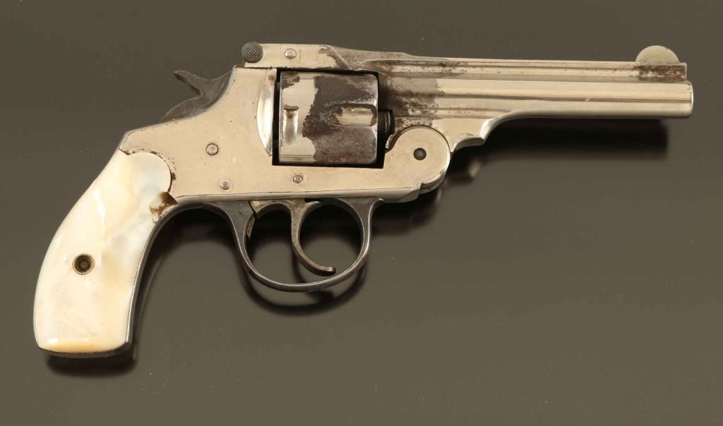 SN: 275 'Second Model' Vintage double action top-break revolver chambered for .38 centerfire, manufactured circa 1896-1908. Features a nickel plated finish, 4" ribbed barrel, round blade front sight, 'u' notched rear sight, fluted five-shot cylinder, smooth case hardened trigger, case hardened hammer with knurled spur, blued trigger guard and two-piece mother of pearl grips. Revolver exhibits approximately 70% of it's original finish showing scattered losses with rust toned and pitting in the void. There is also numbers and initials scratched into the left side if the frame. Action is smooth with play in the lock-up, the bore is fair and mother of pearl grips are near good with a chip towards the top of the right panel. Condition is NRA Good. ***C&R Firearm***