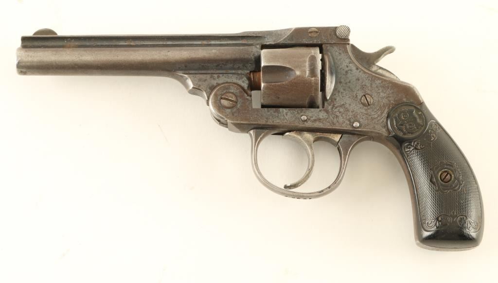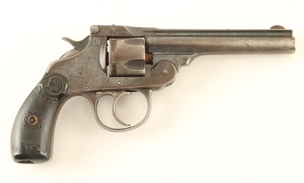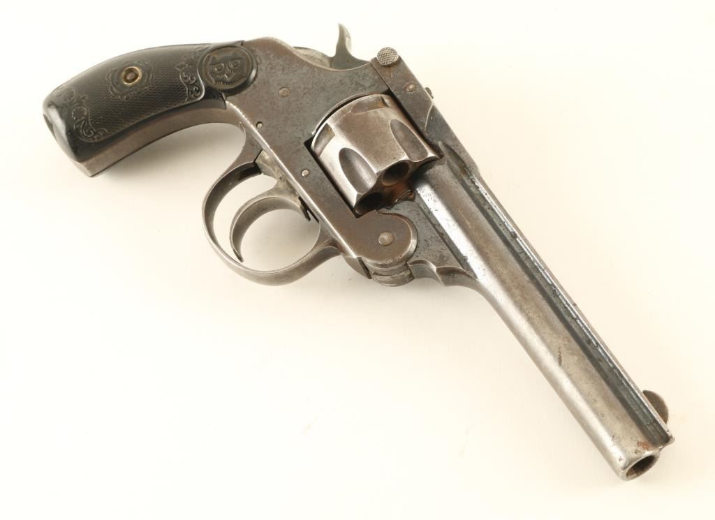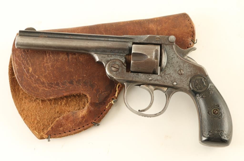 Double/Single action revolver features blued finish, black checkered Gutta Percha grips, 4" barrel, fixed sights. Bore is poor to fair, dark and pitted, visible rifling. Retains 40% finish on metal parts with bright blue visible in recesses, mostly gray or brown color with patina in many places, bare metal on raised edges. Rear of cylinder and charge holes are brown with thin surface rust. Grips are good condition, showing wear with no cracks or chips. Action does not work properly. Extractor start moves but does not snap back after ejection. Includes poor condition leather holster, stitching is partly removed or fallen out, holster held together by metal wire staples. Condition is NRA Poor *** C&R Firearm ***