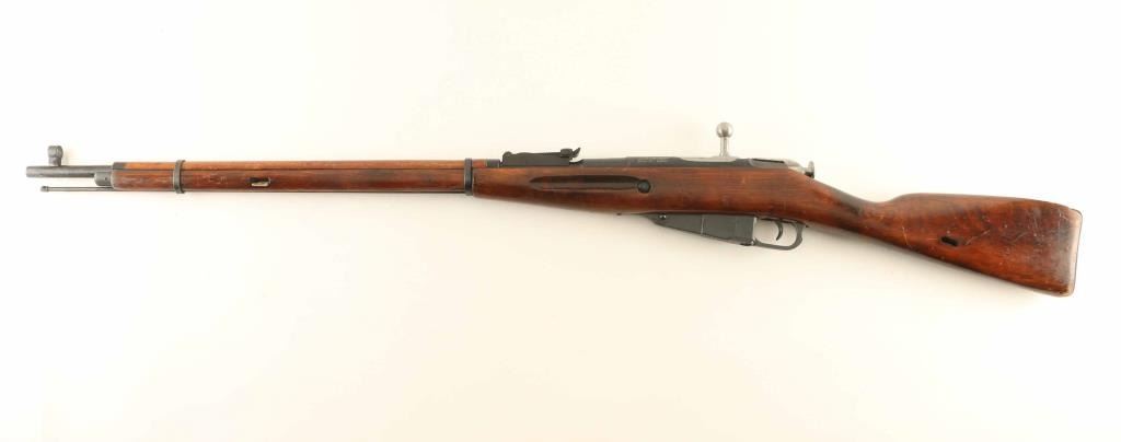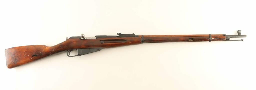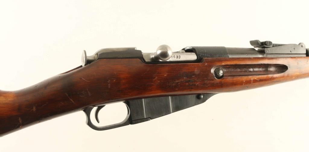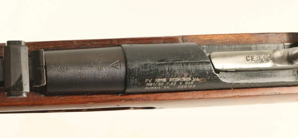 Russian military bolt action rifle manufactured circa 1942, imported by PW Arms, Redmond WA. Features 29" barrel, post-in-ring front sight, tangent style rear sight, manual safety, straight bolt handle, sling slots, cleaning rod under barrel. Bore is good condition, with strong rifling. Metal parts have been refinished with a dark bluing, showing scratches and pits under the finish. Wartime production receiver has rough surface finish. Bolt is in the white, appears good condition. Stock is very good condition, varnished, with scratches and small dents. Serial number is applied by importer, previous Russian number has been over-stamped on several parts during an arsenal rework. Condition is NRA Good *** C&R Firearm ***