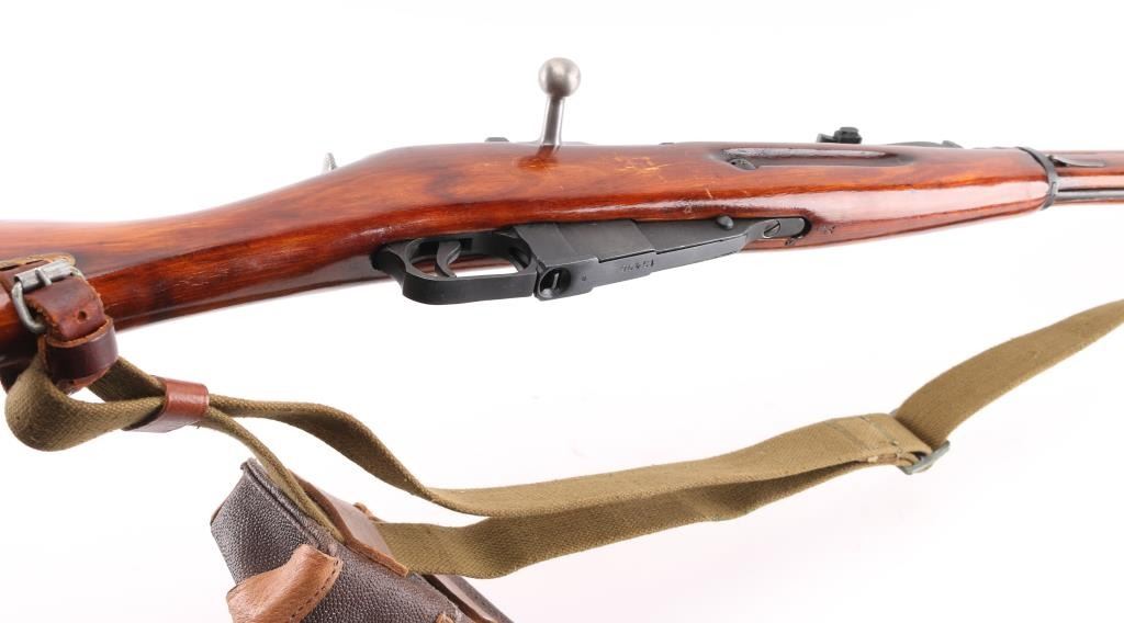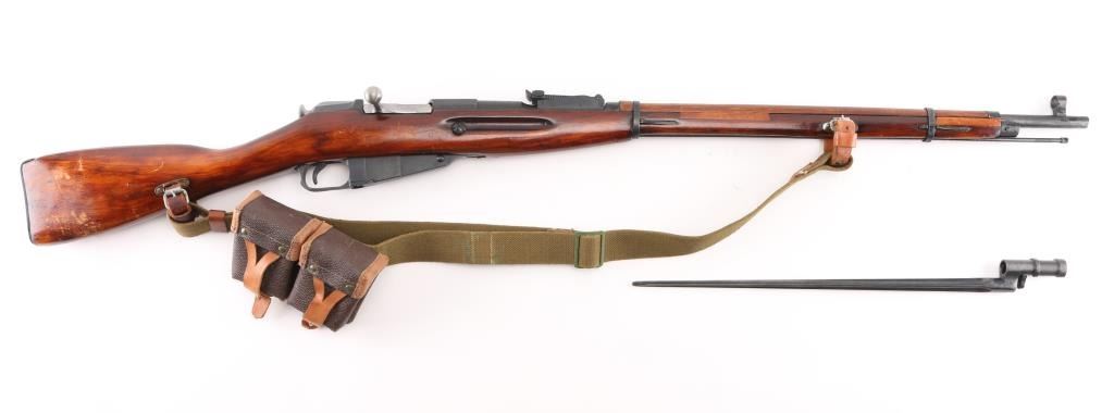 Russian (Soviet Union) WW2 military bolt action rifle dated 1933. Hex Receiver. Imported by CAI (Left Receiver) Arsenal refinished. Features blued finish, wood stock & handguard, 29" barrel, post front sight, tangent rear sight, sling slots. Bore is good condition, strong rifling with some darkness in grooves. Retains 90% dark blue arsenal re-finish, with minor edge wear/scuffs. Bare metal bolt. Wood is very good with minor scratches/scuffs, Original serial number matches on receiver, bolt. floorplate, and steel buttplate. Cleaning rod present. Includes proper web sling, bayonet, ammo pouch, several stripper clips. Condition is NRA Very Good as refinished *** C&R Firearm ***