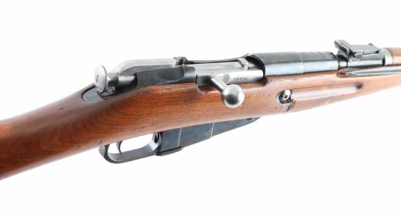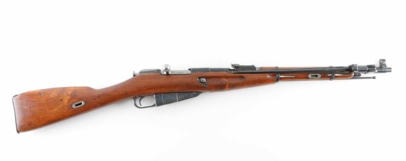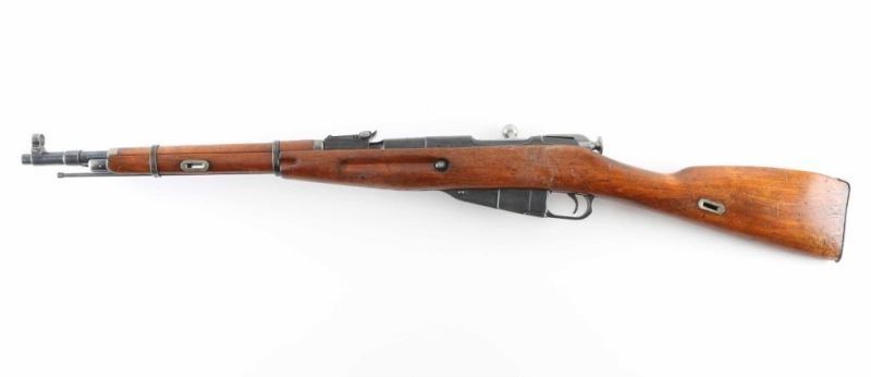 Russian military bolt action rifle dated 1954, imported by CAI, St Albans VT. Features 20" barrel, post front sight inside protective ring, tangent style rear sight, manual safety, straight bolt handle, sling slots, cleaning rod under barrel, folding spike bayonet. Bore is good to very good, showing some frosting, strong rifling. Retains 90% dark blued finish, with small scratches in many places and bare metal at muzzle. Bolt assembly is very good condition bare metal. Rusty spot on heel of buttplate. Wood is very good condition, with scratches & dents. Varnish finish shows drips, several patches on left side where it appears that solvent contact softened the varnish and allowed cloth lint to get embedded into the finish. Some wood loss at toe and right side finger groove, fair fit to buttplate. Numbers on magazine, bolt & barrel match serial number on receiver. Condition is NRA Very Good (refinished stock) *** C&R Firearm ***