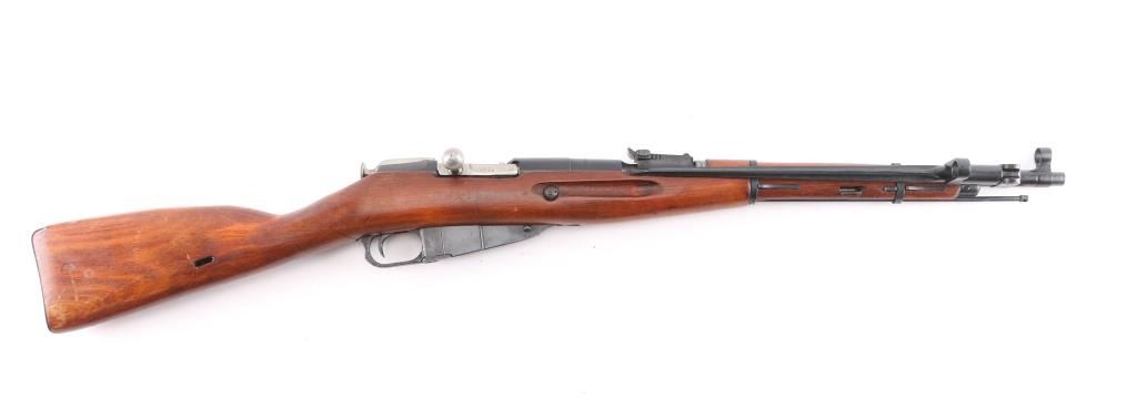 Russian Mosin Nagant military bolt action rifle dated 1944, imported by PW Arms. Features 20" barrel, post front sight inside protective ring, tangent style rear sight, manual safety, straight bolt handle, sling slots, cleaning rod under barrel, folding spike bayonet. Bore is good, light frosting in the grooves, strong rifling. Retains 95% dark blued arsenal refinish with small scratches and handling marks. Bolt assembly is very good polished bare metal. Laminated stock & handguard are good condition, good fit to metal with some finish loss, scratches. Original Russian serial numbers matched barrel shank, floorplate, bolt, & steel butt plate.