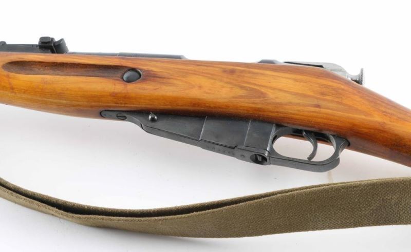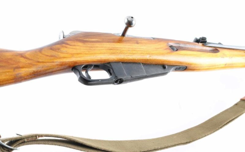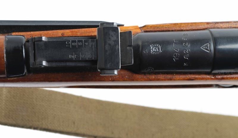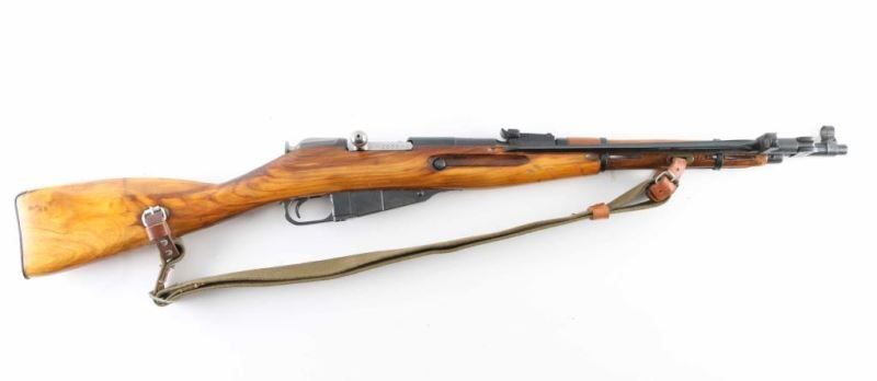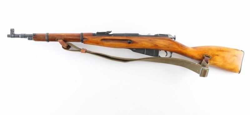 Russian military bolt action rifle manufactured circa 1947, imported by CAI, St Albans VT. Features 20" barrel, post front sight inside protective ring, tangent style rear sight, manual safety, straight bolt handle, sling slots, provision for cleaning rod under barrel (rod missing), folding spike bayonet. Bore is good condition, showing some frosting in grooves, strong rifling. Retains 95% dark blued arsenal refinish with small scratches and handling marks. Bolt assembly is very good polished bare metal. Wood is very good condition, arsenal varnish with several small shallow gouges. Importer serial number is a translation of original Cyrillic alphabet letters. Original serial is repeated on many parts. Number on bolt has different Cyrillic letters, followed by "2292". Includes good condition khaki web sling with leather "dog collars", small pouch of accessories, information booklet. Condition is NRA Very Good (arsenal rebuild) *** C&R Firearm ***