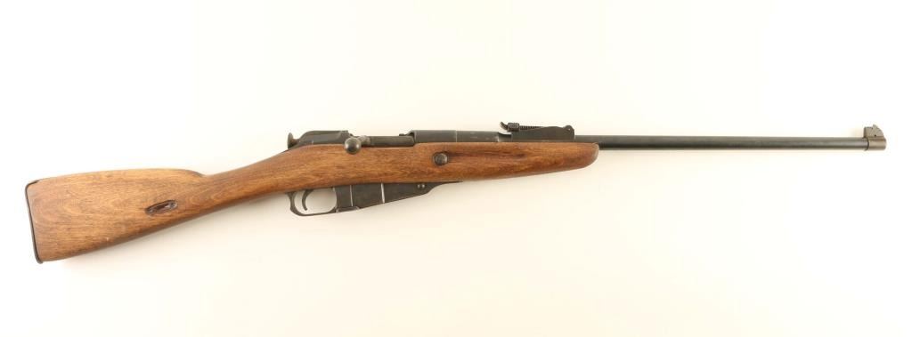 Heavily sporterized Russian military bolt action rifle chambered in 7.62x54Rmm, manufactured at the Izhevsk Arsenal circa 1937. Features a blued finish, 22" barrel, 03-A4 front sight, tangent rear sight graduated to 2,000 meters, smooth trigger, short swept-back bolt handle, fixed 5 round magazine with hinged floorplate, round receiver, and smooth wood straight grip shoulder stock with metal buttplate. Rifle exhibits approximately 80% of its thinned blued finish showing wear and scattered light rust. Action is sound, the bore is dull with good rifling and the sanded wood stock is good though slightly ill-fitting with a couple hairline cracks around where the cleaning rod hole was filled it. Condition is NRA Fair. ***C&R Firearm***