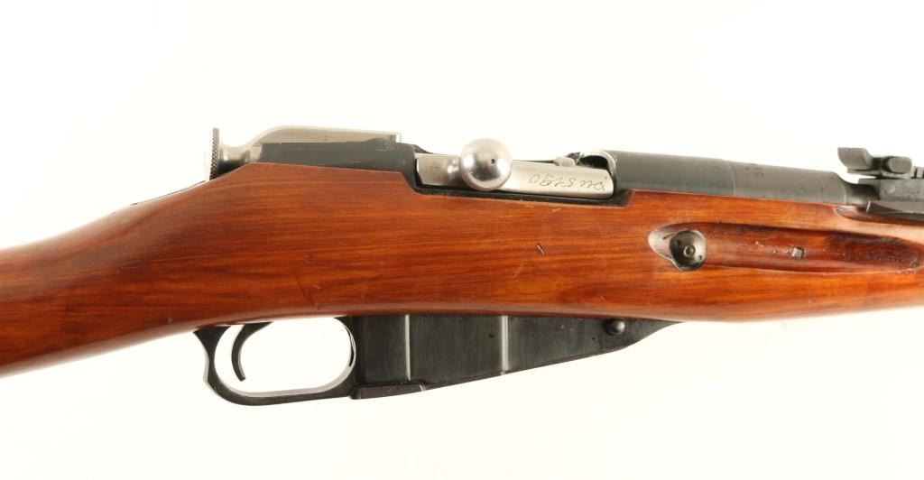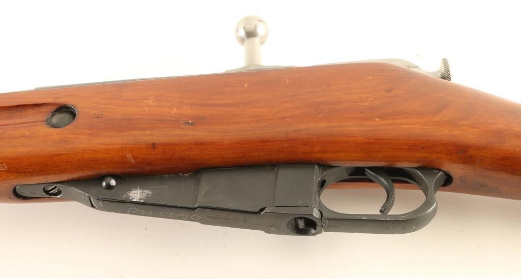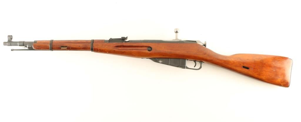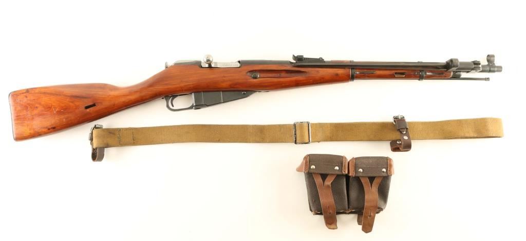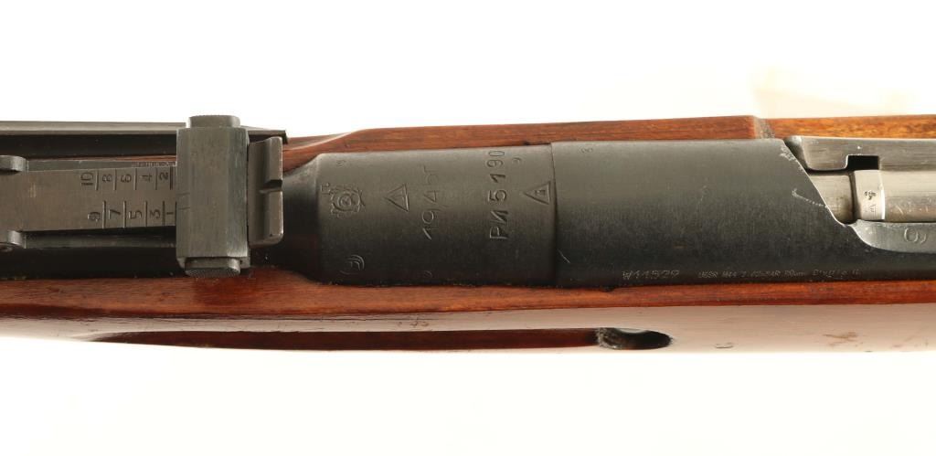 SN: PN5190/W11529 Soviet era (circa 1945) Russian military bolt action carbine imported by R Guns, Carpentersville IL. Features round receiver, approx 20" barrel, cleaning rod under barrel, military sights, straight bolt handle, manual safety, sling slots, folding bayonet. Bore is in very good condition, bright appearance with strong rifling. Metal retains 90% arsenal re-blue with scratches, some bare metal on sharp edges, scuffed area left side of magazine. Bolt is excellent condition, in the white. Wood stock is excellent condition with few scratches and handling marks. Handguard finish is scuffed where barrel bands slide over. Markings include Izhevsk symbol of an arrow inside a triangle, hammer & sickle inside a wreath. Numbered parts are force matched to original Russian numbers using an electro-pencil. Serial number is a new number assigned at import. Includes good condition "dog collar" type green web sling, double pocket cartridge pouch, oiler, misc tools. Condition is NRA Very Good *** C&R Firearm ***