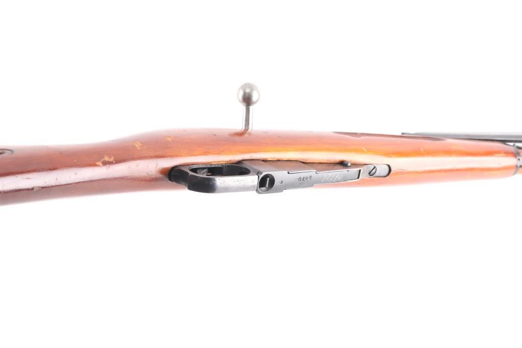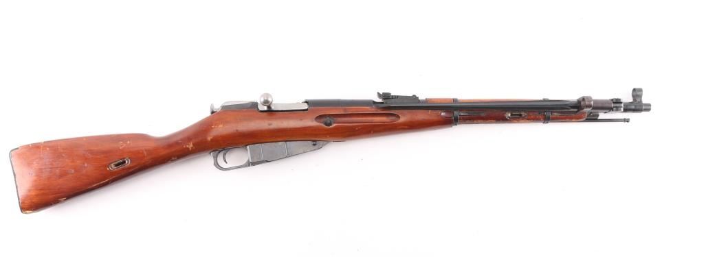 Russian Mosin Nagant military bolt action rifle dated 1944, imported by PW Arms. Features 20" barrel, post front sight inside protective ring, tangent style rear sight, manual safety, straight bolt handle, sling slots, cleaning rod under barrel, folding spike bayonet. Bore is very good, some light frosting, strong rifling. Retains 94% dark blued arsenal refinish with small scratches and handling marks. Bolt assembly is very good polished bare metal. Laminated stock & handguard are good condition, good fit to metal with some finish loss, scratches/gouges. Original Russian serial numbers matched barrel shank, floorplate, bolt, and steel butt plate.(All electropenciled except barrel).