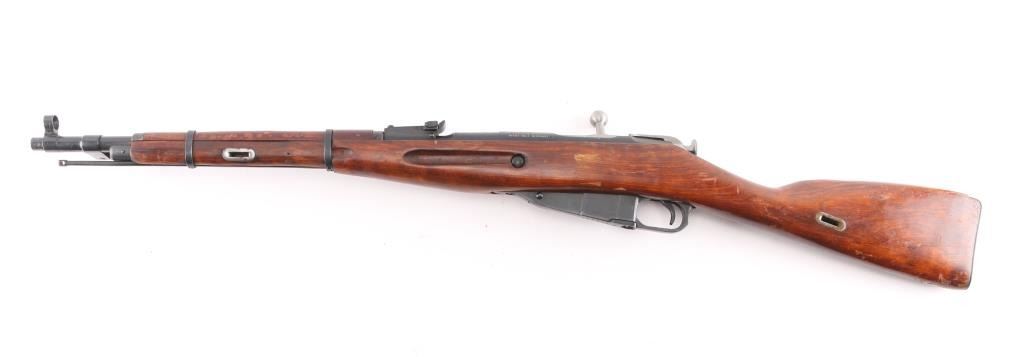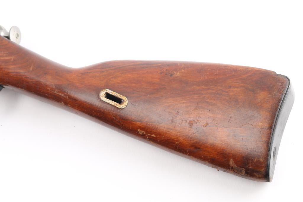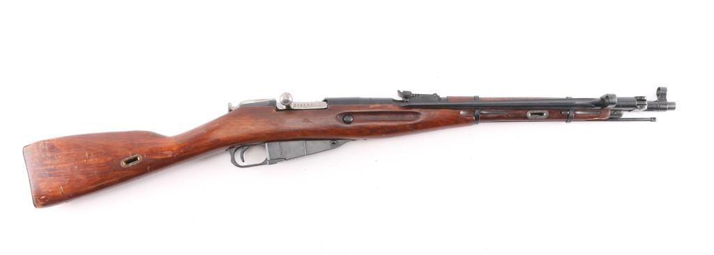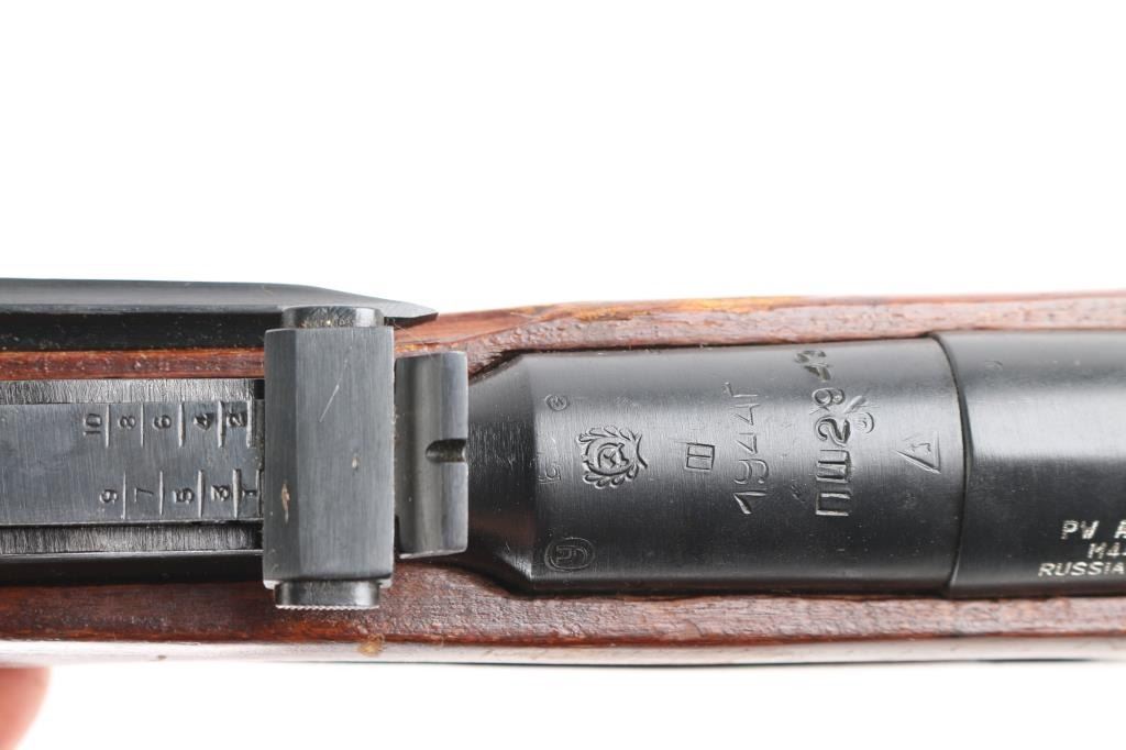 Russian Mosin Nagant military bolt action rifle dated 1944, imported by PW Arms. Features 20" barrel, post front sight inside protective ring, tangent style rear sight, manual safety, straight bolt handle, sling slots, cleaning rod under barrel, folding spike bayonet. Bore is very good, needs cleaning, light frosting in the grooves, strong rifling. Retains 94% dark blued arsenal refinish with small scratches and handling marks. Bolt assembly is very good polished bare metal. Laminated stock & handguard are good condition, good fit to metal with some finish loss, scratches/gouges. Original Russian serial numbers matched on barrel shank, floorplate, bolt, & steel butt plate.