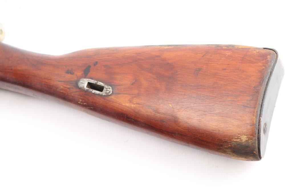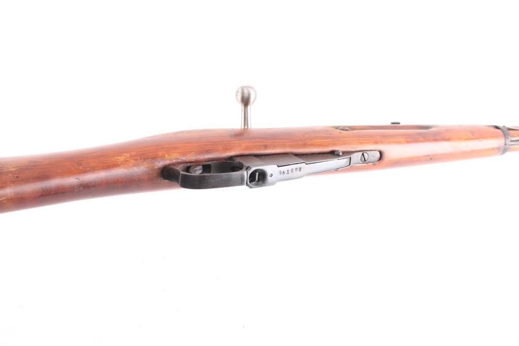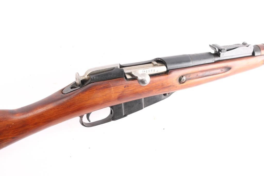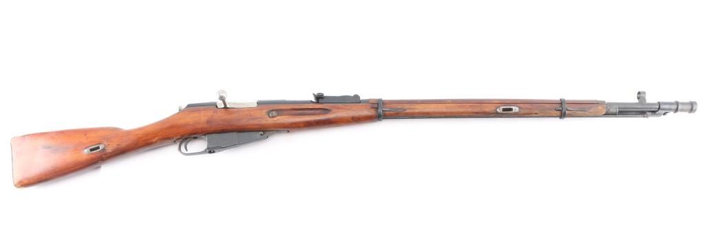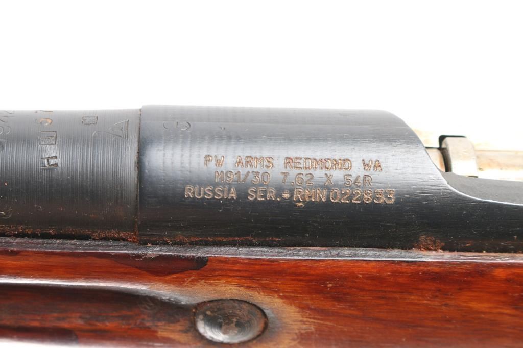 SN:RMN022833. Russian WW2 military bolt action rifle manufactured circa 1942, imported by PW Arms, Redmond WA. 4th Pattern Izhevsk wheat, hammer, & sickle barrel shank markings. Arsenal re-finish. Features 29" barrel, post front sight inside protective ring, tangent style rear sight, straight bolt handle, sling slots, cleaning rod under barrel. Bore is dark/rough, may improve with cleaning, Retains 85% dark blued arsenal refinish with small scratches and handling marks, a couple of small patches of surface rust on the left receiver. Bolt assembly is good polished bare metal, bolt has a patch of surface rust. Wood is good condition, arsenal varnish, finish loss, mostly on the forearm Importer serial number applied to receiver. Original Matching Cyrillic serial number is found on the bolt, barrel, floorplate, & steel butt plate. Comes with bayonet matched to the rifle