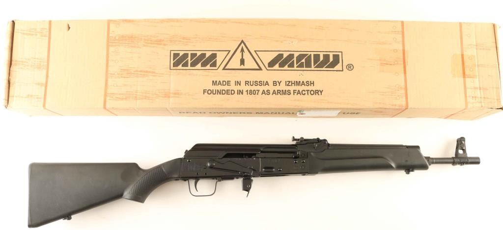 Russian made semi-automatic AK pattern sporting rifle chambered in 7.62x39mm. Imported by the Mercury Hermes of Louisville, Kentucky with import marks on the left side of the receiver. Features a matte black finish, 16.34" barrel, shrouded adjustable post front sight, tangent rear sight graduated to 300 meters, stamped receiver with side mounted scope rail, smooth trigger, manual safety, bolt hold open lever, sling swivels, no magazine, contoured black synthetic forend, and checkered pistol grip shoulder stock. Includes the original factory cardboard box. Rifle retains approximately 97% of it's original finish showing a few scattered scratches and a bright drag line from the selector. Action is smooth, the bore is excellent, and the polymer stocks are fine. Condition is NRA Excellent in box. ***Modern Firearm***