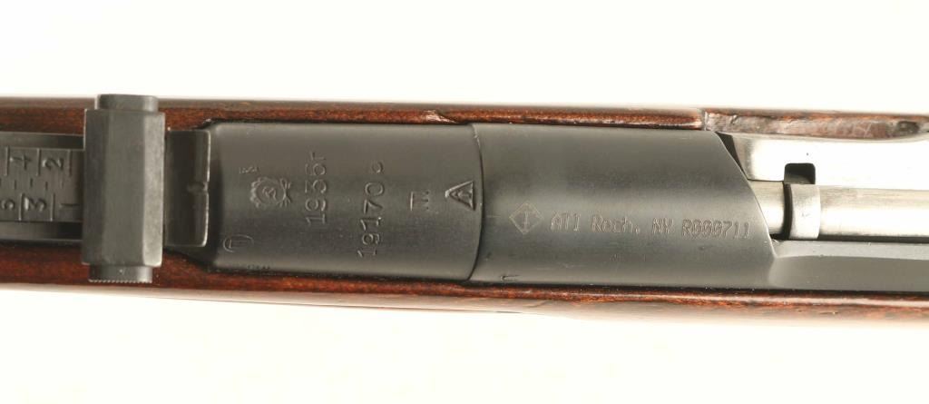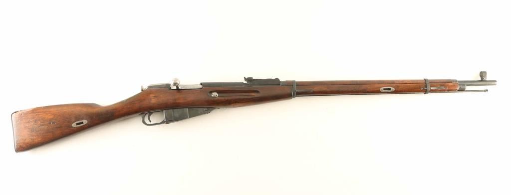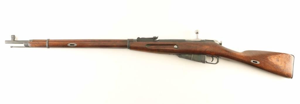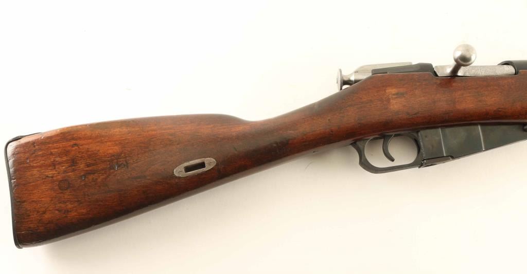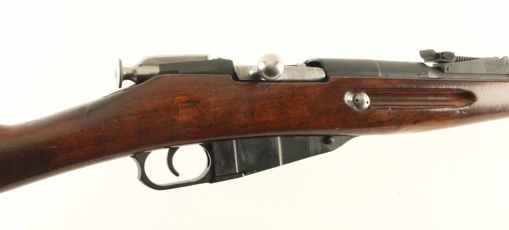 Russian military bolt action rifle manufactured circa 1936, imported by ATI, Rochester NY. Features 29" barrel, post-in-ring front sight, tangent style rear sight, manual safety, straight bolt handle, sling slots, cleaning rod under barrel. Bore is fair condition, dark with strong rifling. Metal parts have been refinished with a dark matte bluing, showing scratches and pits under the finish. Bolt is in the white, very good condition. Stock is very good condition with a heavy coat of varnish applied, with visible drips and runs, visible dents and gouges underneath. Serial number is applied by importer, previous Russian number has been scribed on several parts during an arsenal rework. Condition is NRA Good *** C&R Firearm ***