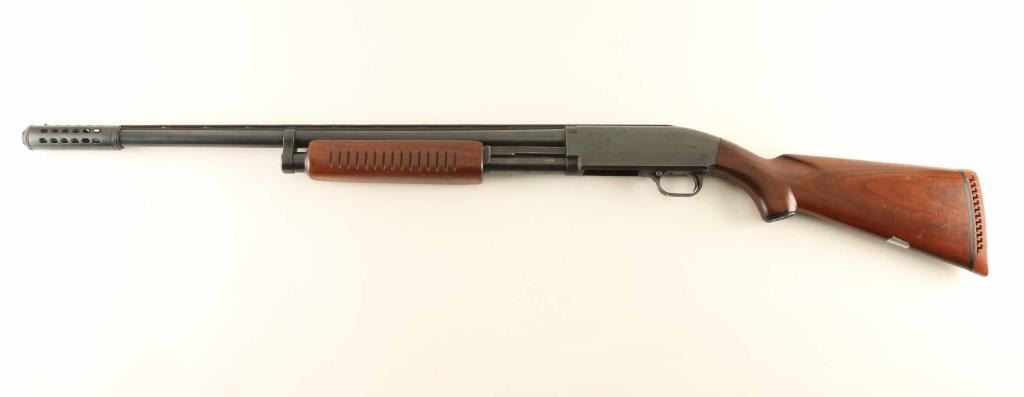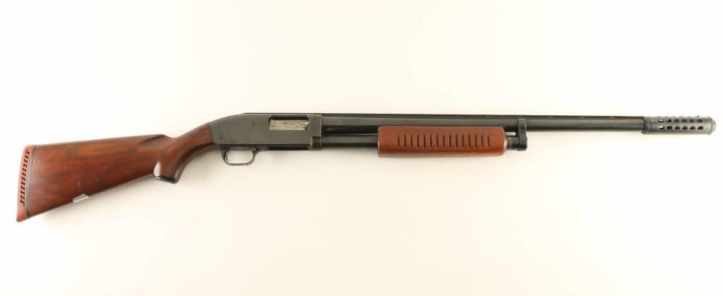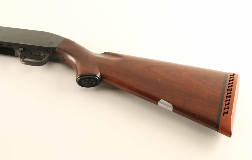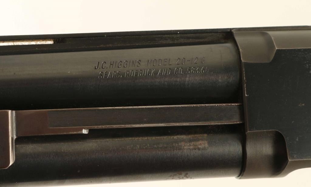 Pump action shotgun features 22" vent rib barrel with "Long Range" marked external choke tube & recoil reducer (marked "JC Higgins, adds another approx 4" to length, measures as MOD choke), brass front bead on top of extended choke, blued finish, wood stock & pump handle, ventilated rubber recoil pad, manual safety. Bore is good to very good condition, cleaning should improve. Retains 80% blue, with bare metal on sharp edges, where action rubs, where scratched. Wood is very good condition with scratches, scrapes. Safety set up for left handed use. Condition is NRA Very Good *** C&R Firearm ***