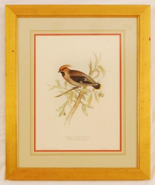 J & E Gould. 19th century hand colored lithograph of "Waxen Chatterer". 17" x 12". Fine Frame