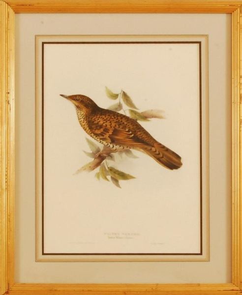 J & E Gould. 19th century hand colored lithograph of "Whites Thrush". 17" x 12". Fine Frame