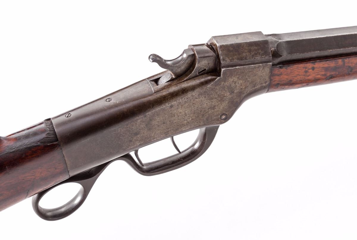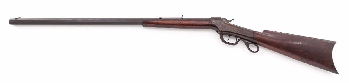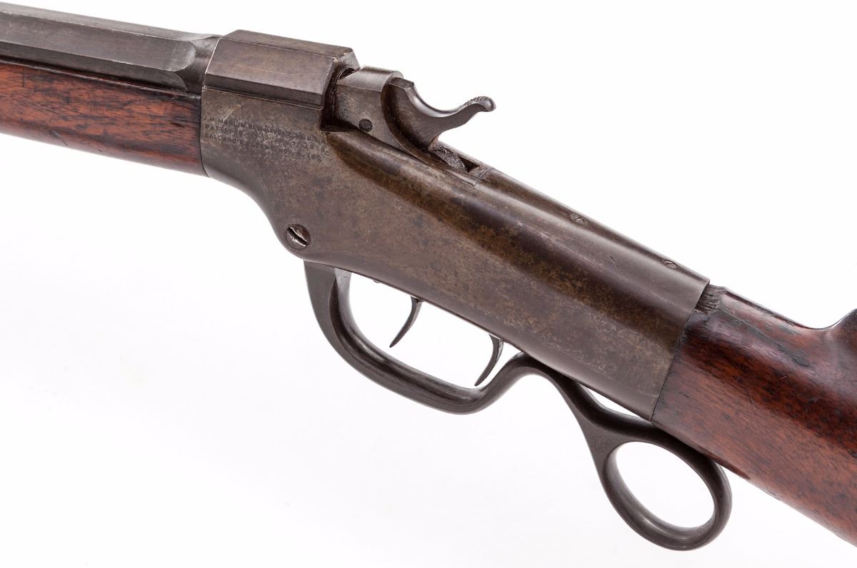 J.M. Marlin Ballard's Patent Lever Action Rifle, #15846, .38-50 cal., 30'' barrel, brown finish, smooth two-piece walnut stock, receiver marked ''J.M. Marlin, New Haven'' and ''Ballard's Patent'', with dovetailed blade front sight and buckhorn rear sight. Condition is good with an even brown patina overall. Forearm finish has darkened and has numerous dents and scrapes, with slight loss along the right side barrel channel; buttstock has darkened with numerous dents and scrapes and a chip missing behind receiver. Action is tight with slight corrosion near the chamber that may clean; bore is bright, primary trigger functions, set trigger does not set. Est.: $600-$800. (Antique)