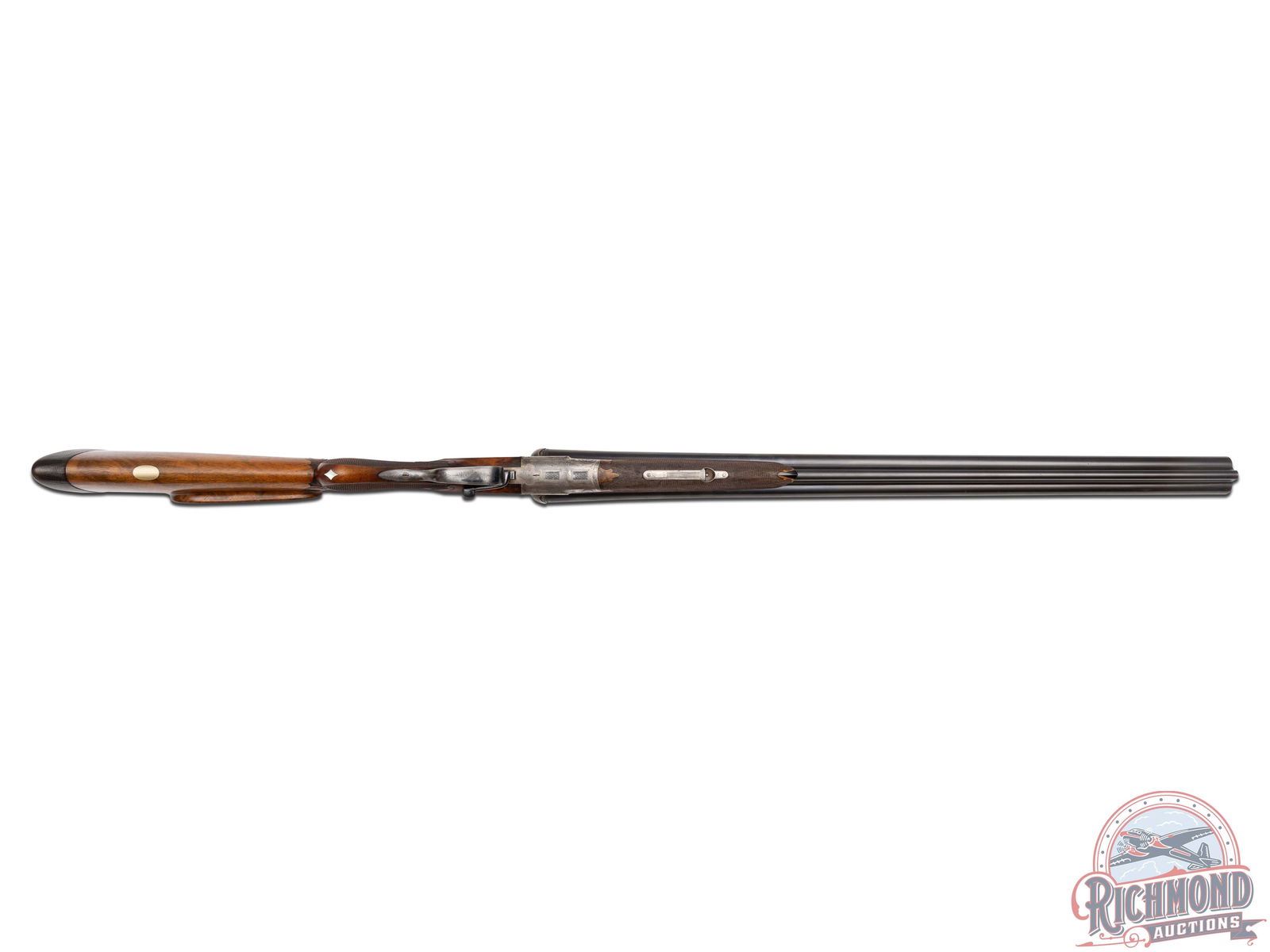 Manufactured for Charles Daly of New York, New York by J.P. Sauer and Son in Prussia in 1908. Features a special order with very rare carved checkering borders. Fitted with 28" Krupp steel barrels with 12 gauge side by side over .30-30 WIN caliber rifle. Barrels have matted rib with steel marking, rifle sights, extractors and "J.P. Sauer and Son" barrel stampings at breech. Case-hardened Diamond Quality sidelock action with scroll engraving, cocking indicators, side clips and Greener crossbolt. Action is marked on each side "Charles Daly" and has blued rifle side cocking lever, tang safety, hidden tang peep sight and pierced double triggers. Select walnut rare checkered round knob pistol grip stock with floral carved border, diamond ebony grip inlay, gold oval vanity plaque, right hand cheekpiece and leather cover recoil pad. Matching checkered splinter forearm with carved borders, ebony inlay and latch release. Comes in a green canvas trunk case with leather straps. Nice quality drilling with special order carved wood feature not often seen. LOP: 14-1/4". DAC: 1-1/2". DAH: 2". CALIBER: 12x12 / 30-30 WIN. S/N: 143180. FFL STATUS: Curio & Relic.