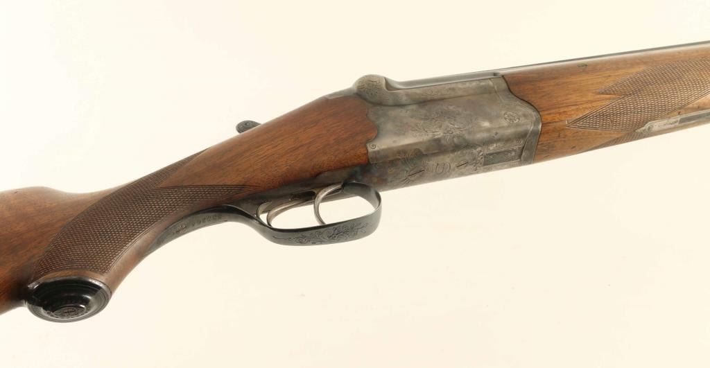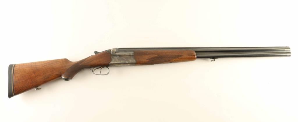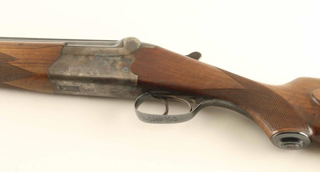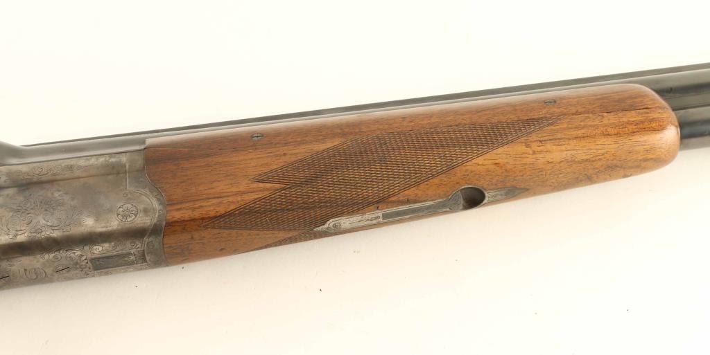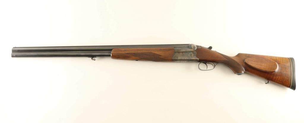 German Over &Under shotgun features 27.5" barrels with raised solid matted top rib, steel bead front sight, double triggers, top lever, tang safety, selective extraction, checkered wood forend, wood butt with checkered curved grip & right hand pancake cheekpiece, solid rubber recoil pad, sling swivels. Briley choke tubes installed, not removed for inspection, measure IM / IC with bore gauge. Bores are very good condition. Blued barrels retain 90-% finish with edge wear and scratches. Lightly engraved receiver is case colored, very good condition with some bright colors visible. Forend is good to very good, three pieces with side panels screwed to barrels at side rib. Stock is very good condition. Condition is NRA Very Good *** Modern Firearm ***