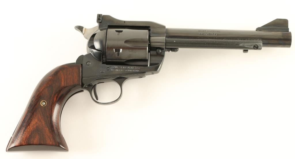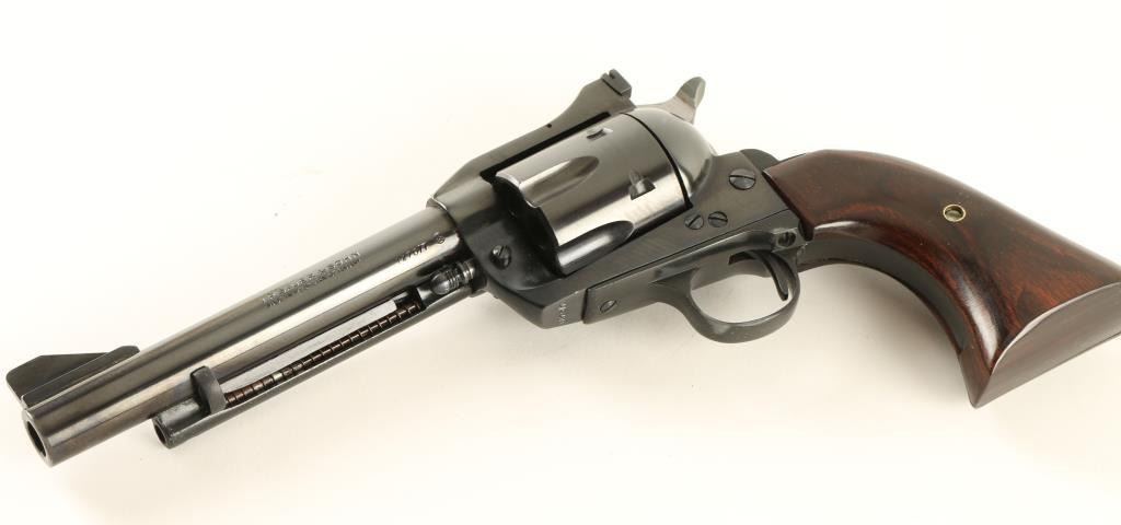 SN: 147017 German hade large frame single action revolver chambered in .44 Magnum. Features a blued finish, 6" barrel, ejector rod, large blade front sight, adjustable window rear sight, fluted six shot cylinder, checkered hammer spur and two piece rosewood oversized grips. Revolver retains approximately 90% of it's blued finish with flaking on ejector rod housing and trigger guard. Action is smooth, bore is excellent and grips are fine. Condition is very good+. ***Modern Firearm***