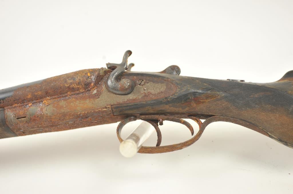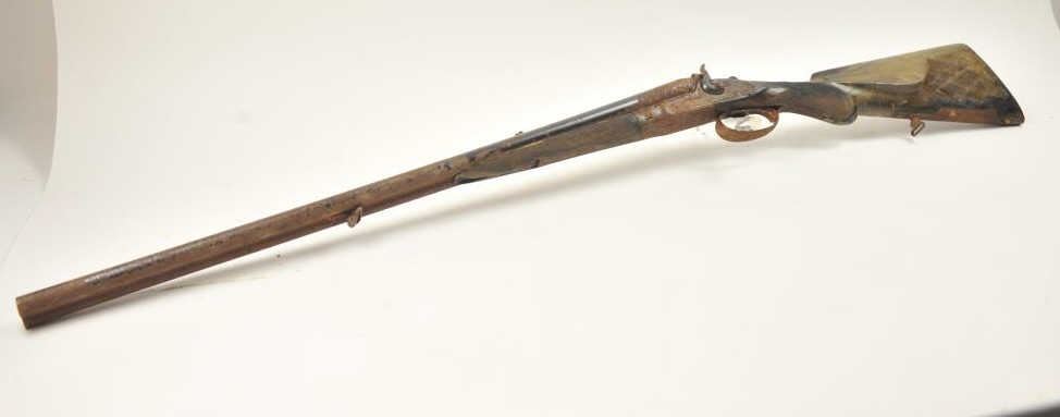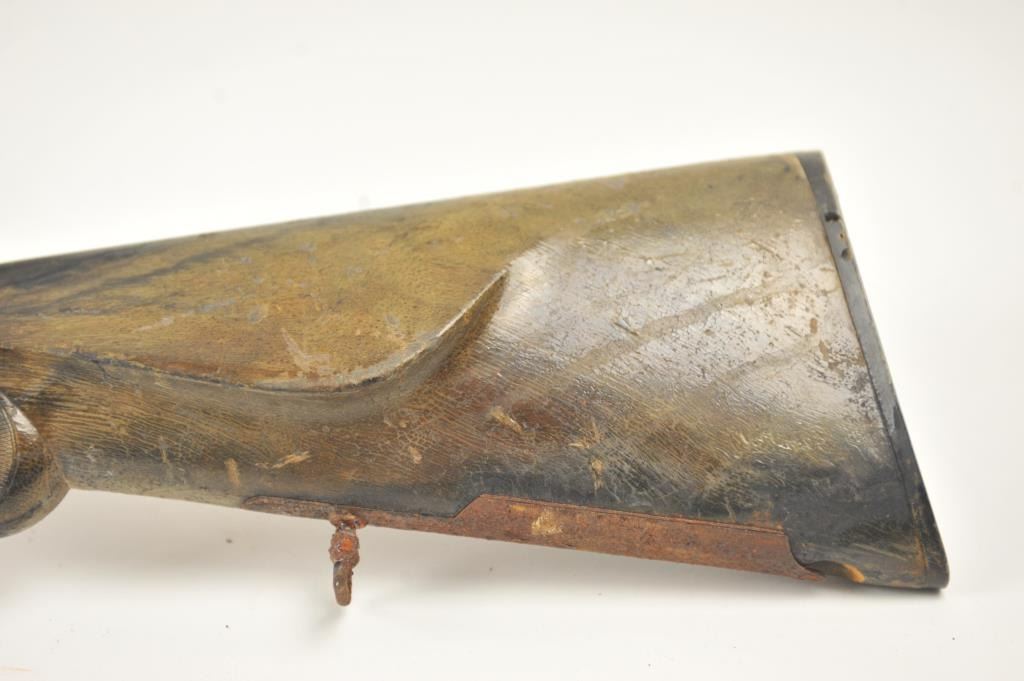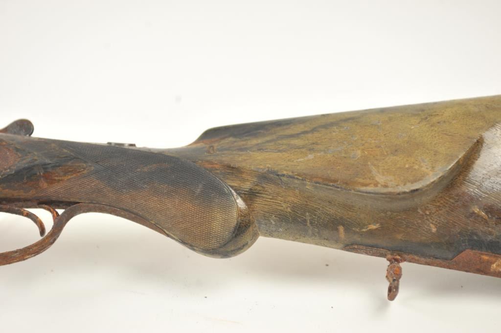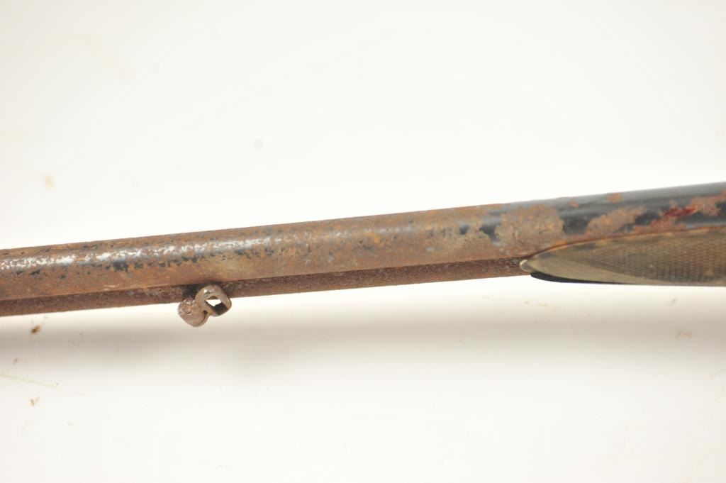 J.P. Sauer & Sohn Exposed Hammer double rifle, 11mm caliber, Serial #38344. The rifle is water damaged and rusted, needing restoration. The rifle is sold as is, where is, with no warranty made or implied. Therifle has 26” barrels with a full-length filed rib with two leaf express rear sight. The side lock action has engraved hammers, tang mount peep sight and a trap in the butt stock. The LOP is 14” to the front trigger. Est.: $300-$600. (C+R).