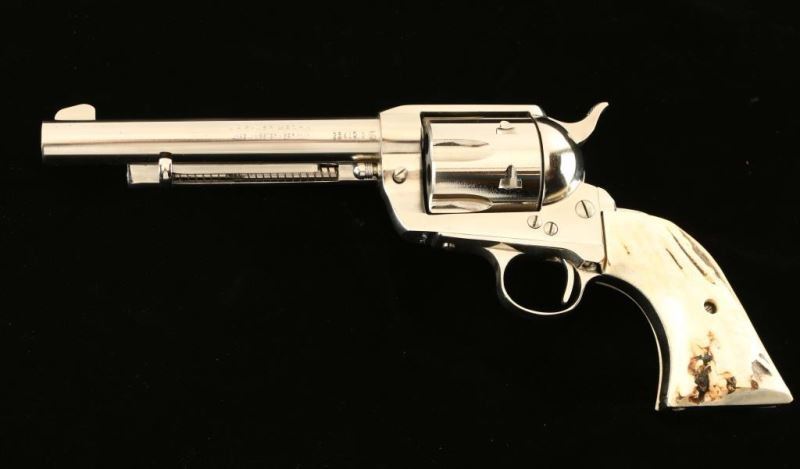 Sn: 25410/3 Single action revolver with 5 1/2" barrel. Nickel with stag grips. Good quality steel frame single action made in the 1960-70s. 95-98% nickel, minor use and firing. *Modern Firearm*