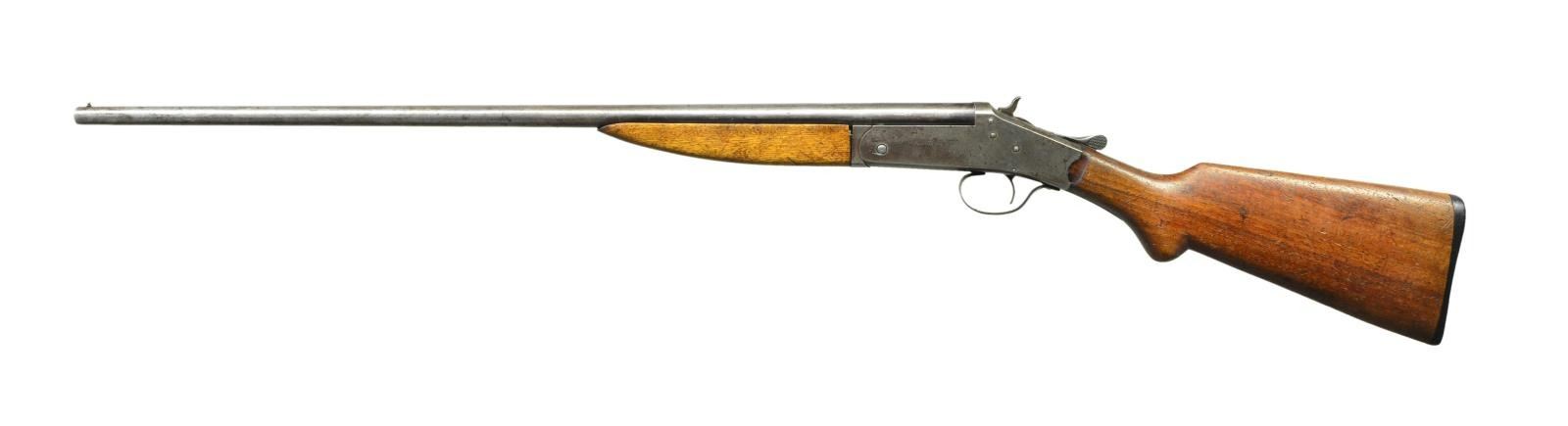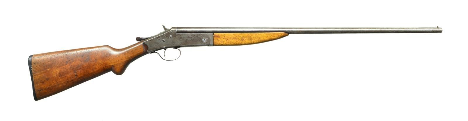 Cal. 410. S# 418EL. Bbl. 26". Mfg. 1916-1935. Lightweight single shot shotgun chambered in 410 Bore / 12mm. Blued finish. Brass bead front sight. Extractor at 6 O'clock. Hardwood forend & stock w/ black plastic buttplate & round pistol grip. LOP: 13.5. It is important to note that any .410 bore gun produced between circa 1900 and 1933 will be chambered for the 2" Eley cartridge or the 2 1/2" shell only and should not be fired with a 3" .410 bore shell. CONDITION: original metal finish has thinned to a gray w/ some very light peppery oxidation. Wood furniture has several light impressions w/ only 1 fine split, approximately 1" in length on right side of forend. Bore is shiny. (22-6248/JZ). CURIO. $200-300.