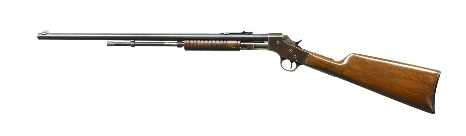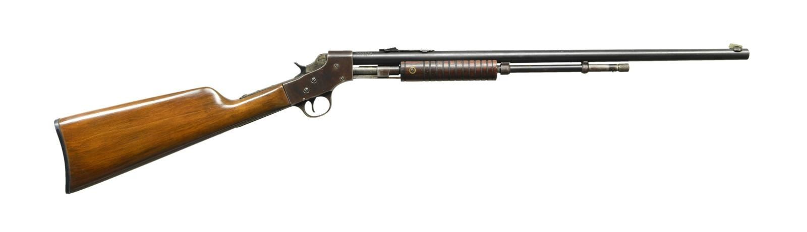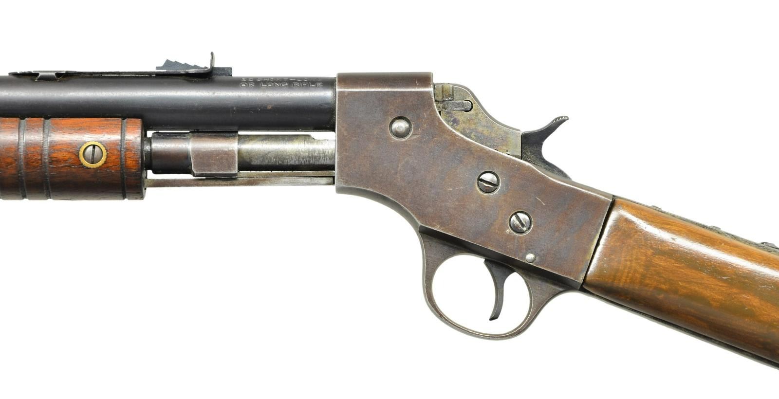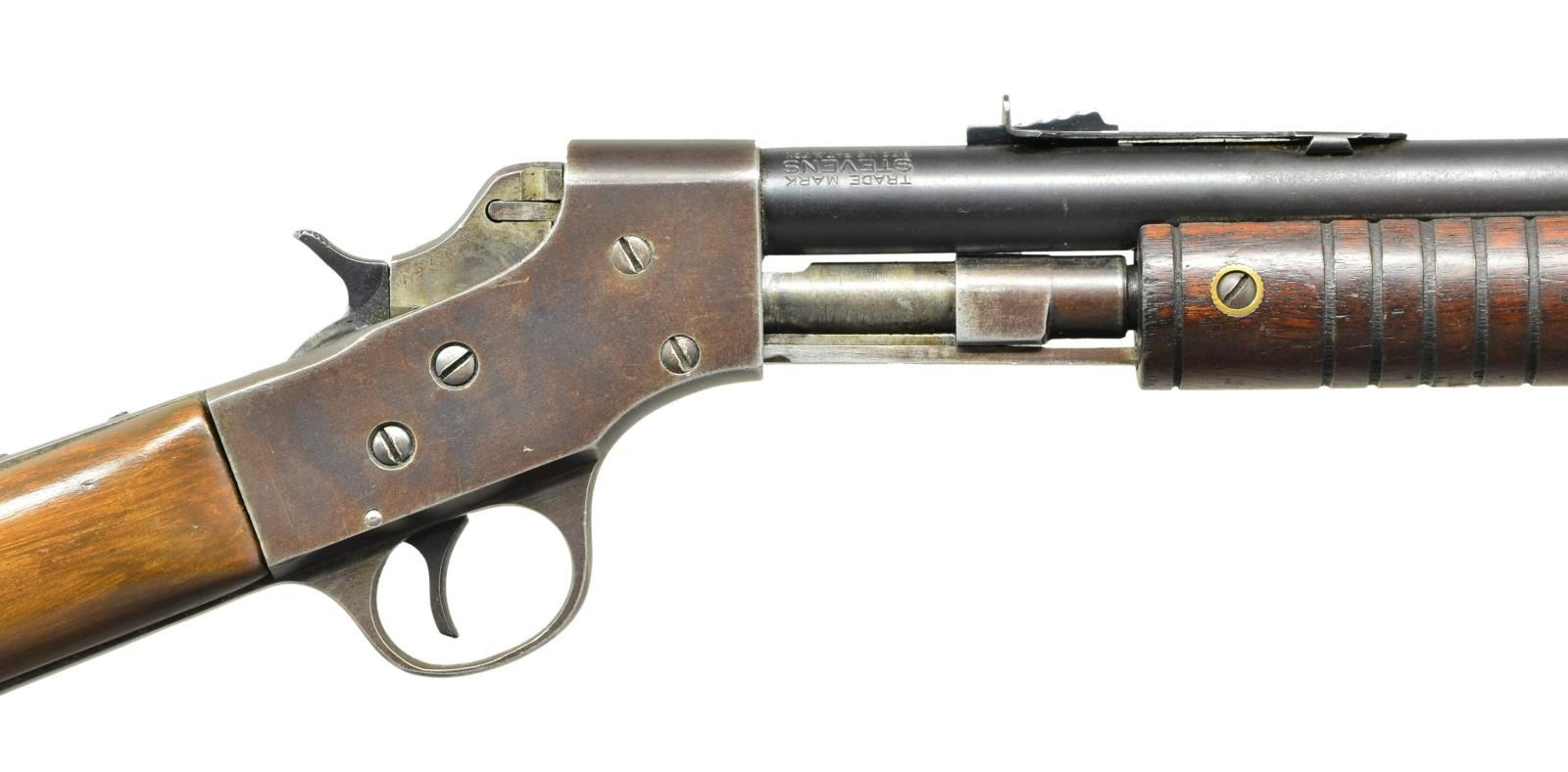 RIFLE. Cal. 22 S, L, LR. S# D571. Bbl. 22". German silver blade front sight & elevator rear sight. Tubular mag. Grooved walnut handle & straight grip stock w/ Stevens buttplate. CONDITION: good blue blending w/ brown patina & peppery oxidation. Action a brown patina appearance w/ wear & pinprick oxidation. Good original finished handle w/ light marks. Sanded & refinished stock has shrunk fit around action. Hammer periodically follows breech block when cycling, needs gunsmith attention. Fair bore has pitting throughout & distinct rifling. (22-6238/MD). CURIO. $150-250.