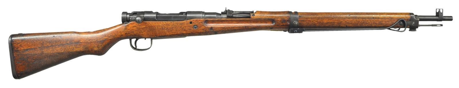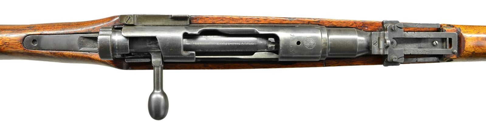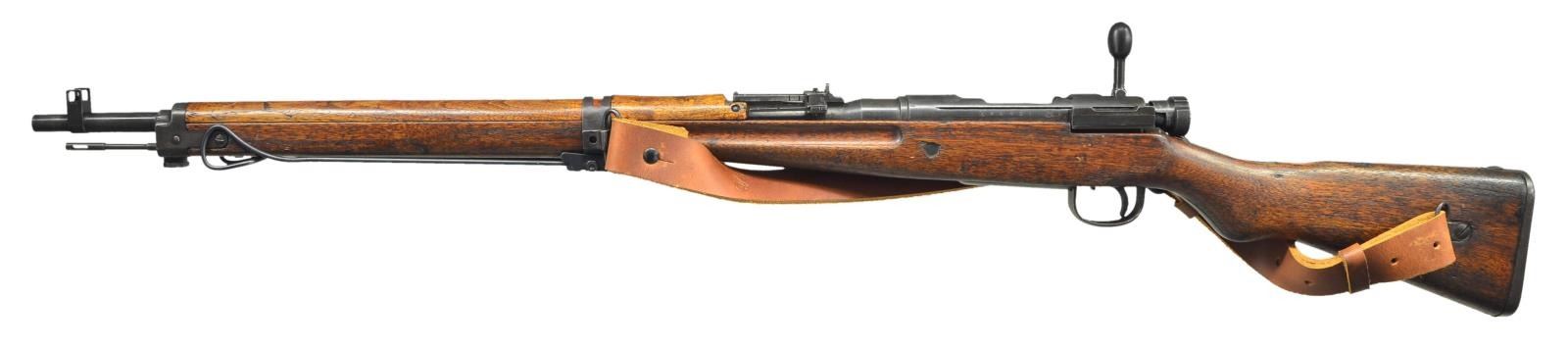 Cal. 7.7 Jap. S# 46421. Bbl. 25 1/2". Matching numbers on bolt handle, safety & bayonet lug. Firing pin & extractor appear unnumbered. Receiver top has full mum & Type 99 markings. Left side of receiver has series marking that appears to be 20th series, serial number & Kokura symbol. Aperture rear sight graduated to 1500m w/ AA wings. Blade front sight w/ protective ears. Monopod present w/ curved foot. Asian hardwood stock w/ two piece construction. Left side sling swivels w/ reproduction Type 99 sling. Cleaning rod present. CONDITION: stock appears lightly sanded w/ added oil finish, scattered dings & handling marks. Metal is mostly a brown patina w/ some areas that appear touched up, a few light dings & some scattered light oxidation. Good bore w/ some frosting. (23-945/MJC). CURIO. $300-500.