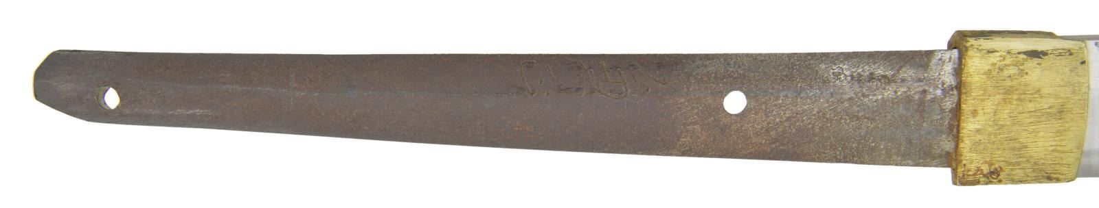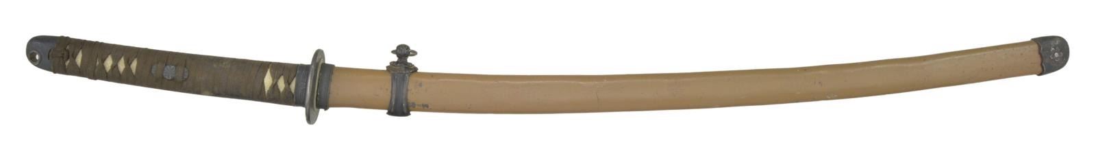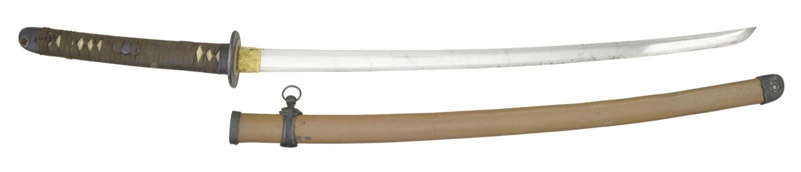Overall length: 39 1/4”. Blade length: 27 1/4". Blade has a straight hamon with a gilded brass habaki. There is one seppa above & below the tsuba. Tsuba is plain iron with no embellishments. The nakago has a 7-character signature on one side and a 4-character signature on the other. The nakago has a mekugi-ana in the normal position and a second near the tip of the nakago. The tsuka has white same with dark brown tsuka-ito. There is a darkened iron 3 cherry blossom menuki on each side. The kabuto-gane and fuchi are both iron. The iron saya has a field green painted finish with darkened iron mounts. CONDITION: blade has scattered light staining throughout. The tsuka shows light wear. The saya retains over 95% of its original finish. The spring release catch securing the blade in the saya is missing. PROVENANCE: From the Lifelong Collection of Glen E. Mattox. (02-18409/BF). $300-500.