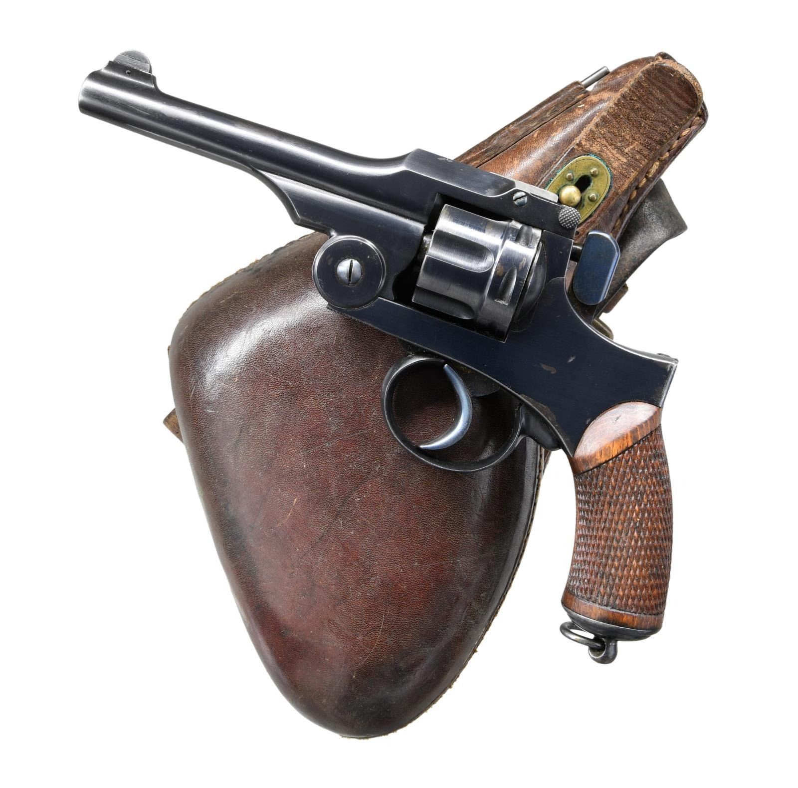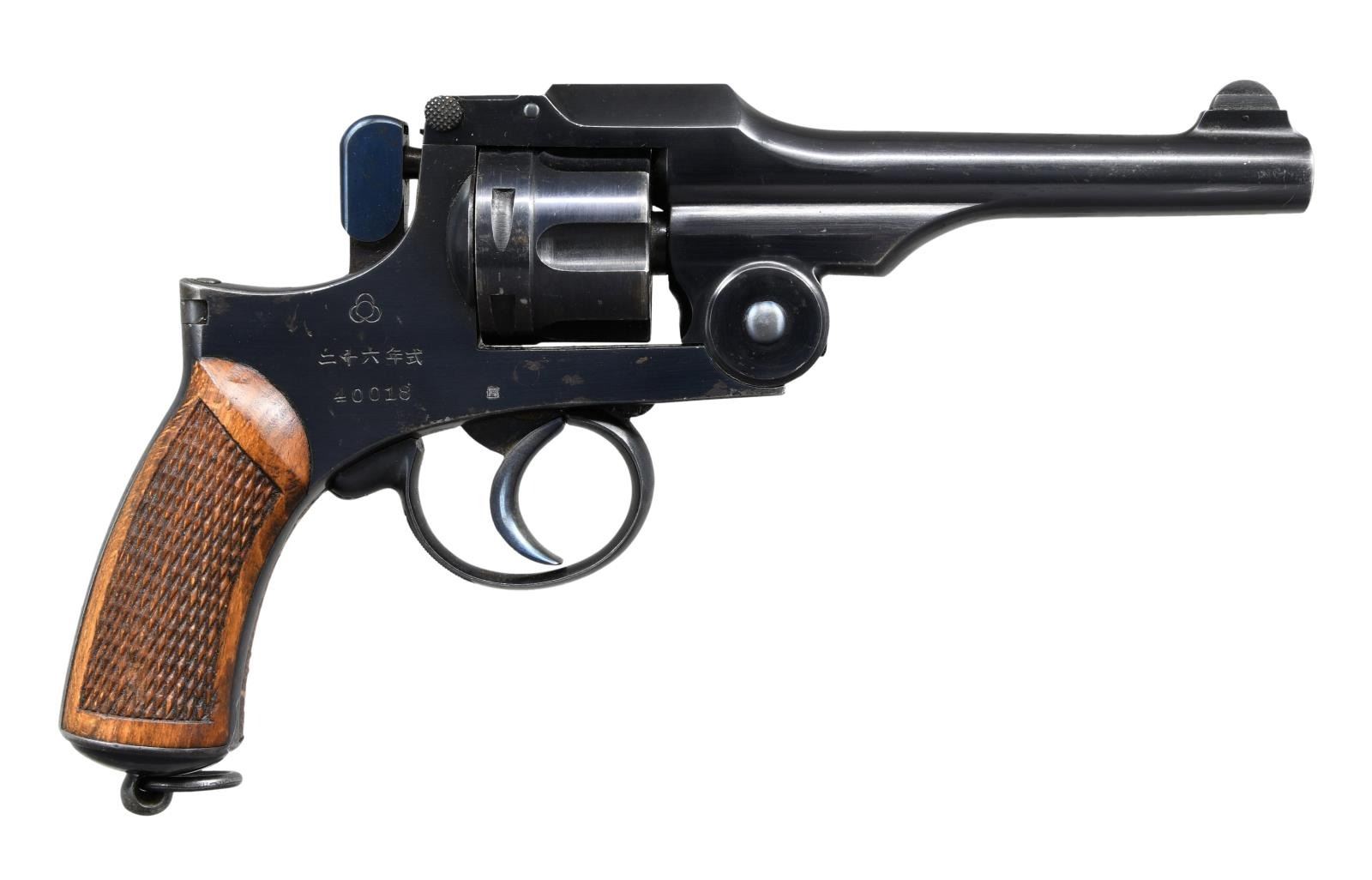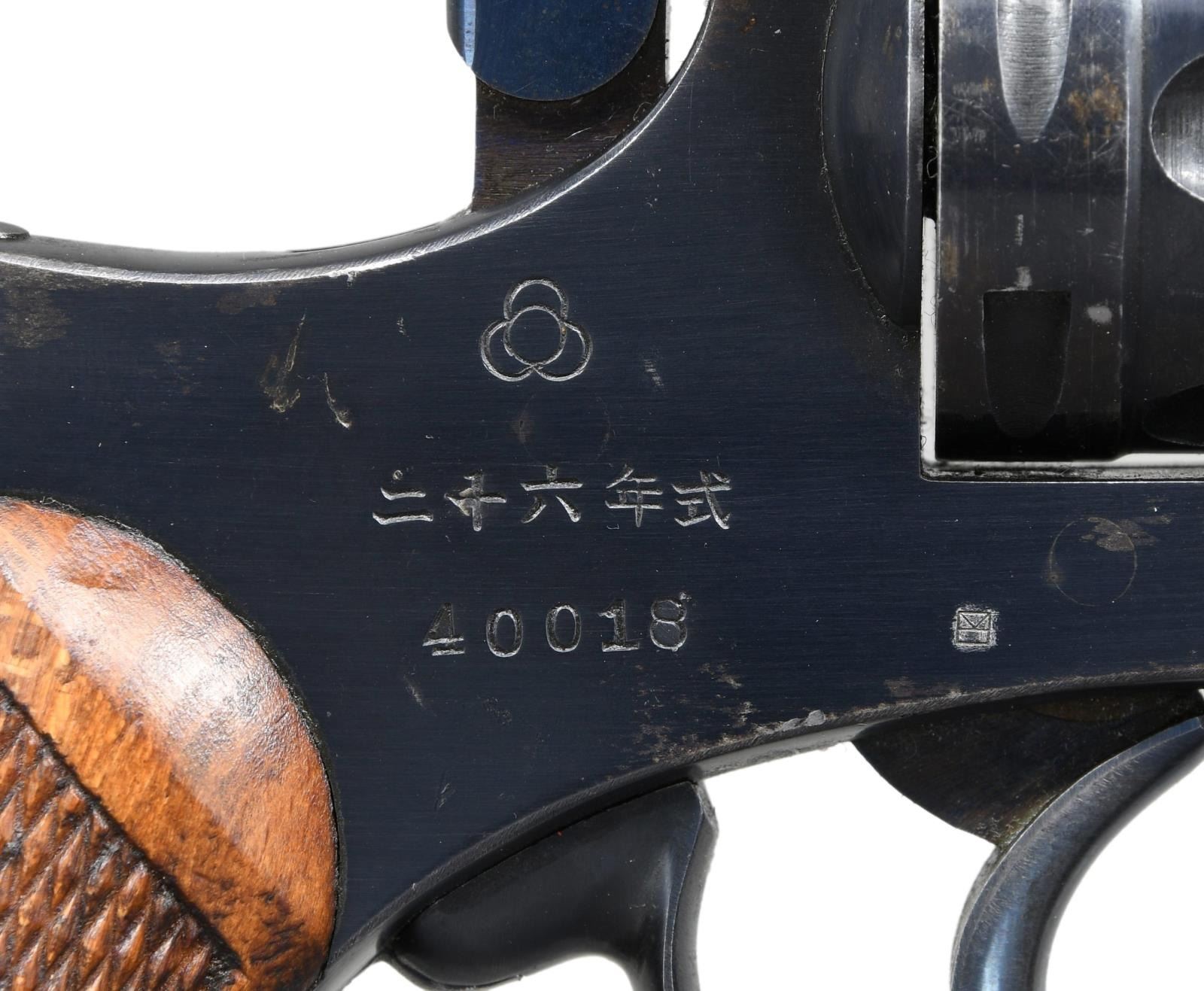 REVOLVER. Cal. 9x22Rmm. S# 40018. Bbl. 4 3/4" w/ fixed sights. Top break. DAO. Very nice condition; standard production Model 26 revolver. Frame marked on right side w/ Koishikawa Arsenal interlocking circles, 26 Type Japanese characters & S#. Cyl. numbered at rear "24". Grip frame marked inside on left "724". Left grip marked "724". Checkered Mahogany grips. Lanyard ring on butt which is marked w/ tiny acceptance marks. UNATTACHED ACCESSORIES: brown leather clamshell holster w/ ammunition pouch & shoulder strap. Holster flap marked inside w/ several Japanese characters. Correct cleaning rod is present. Also included are 26 rds. of original Japanese loaded ammunition. Rds. are not head stamped & are loaded w/ rnd. nose lead bullets. Ammunition has turned mostly patina w/ areas of verdigris. CONDITION: revolver retains a high degree of its original blue finish including fire blue on the trigger & hammer. There is light high point wear & a sm. amount of holster wear near the muzzle plus scattered spots of light oxidation throughout while leaving crisp markings and an attractive appearance. The revolver does however have a sm. blemish at the checkered end of the swing out sideplate on the left side due to improper attempt at disassembly, however this does not detract from the appearance of the gun. Grips are in good condition w/ several sm. scattered handling marks & very lightly worn diamonds. Very good shiny bore. PROVENANCE: From the Lifelong Collection of Glen E. Mattox. (23-71/RW). CURIO. $500-800.