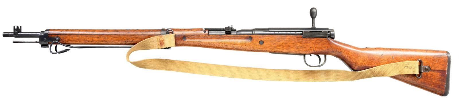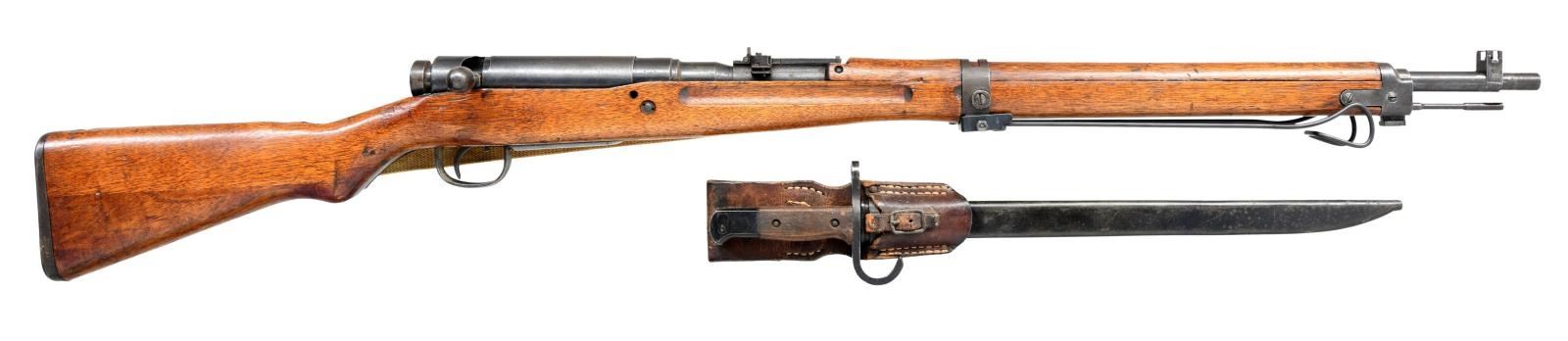 Cal. 7.7 Jap. S# 77602. All visible numbers match including the correct dust cover. Bbl. 25 1/2". Ladder aperture rear sight graduated to 1500 meters. AA wings are not present leaving the attaching screws in place. Inverted V front sight w/ protective ears. Receiver has intact "mum" & type 99 characters. Left rail has Nagoya arsenal marking. Bolt handle has oval knob. Checkered notched safety knob. Cleaning rod not readily removed. Three screw upper band. Lower band retains modern replacement monopod. Hardwood stock set w/ long handguard, two piece buttstock, sm. recoil bolt, cup buttplate plus a two screw rear swivel. Period tan web sling stitched in place. UNATTACHED ACCESSORIES: 15 3/4" fullered blade bayonet. High condition bayonet is marked on right ricasso w/ interlocking circles & “M” w/ arrow “National Denki Company”. Cross guard has curved quillon. Smooth hardwood grips; birds head pommel w/ flat sides. Steel scabbard w/ correct brown leather frog. Bayonet is in very good condition retaining most of its original blue finish. Steel scabbard has light wear w/ spots of fine oxidation & several sm. dents. Frog has wear & scuffing w/ intact stitching. CONDITION: stock set has original finish w/ light to mod. Wear & scattered handling marks. Forend has noticeable scratches on the left side from improper removal of lower band. Metal retains 75% original blue finish w/ thinning & light wear plus peppery oxidation. Mono pod & left upper band screw appear to be replacements. Good shiny bore. PROVENANCE: From the Lifelong Collection of Glen E. Mattox. (23-85/RW). CURIO. $400-600.