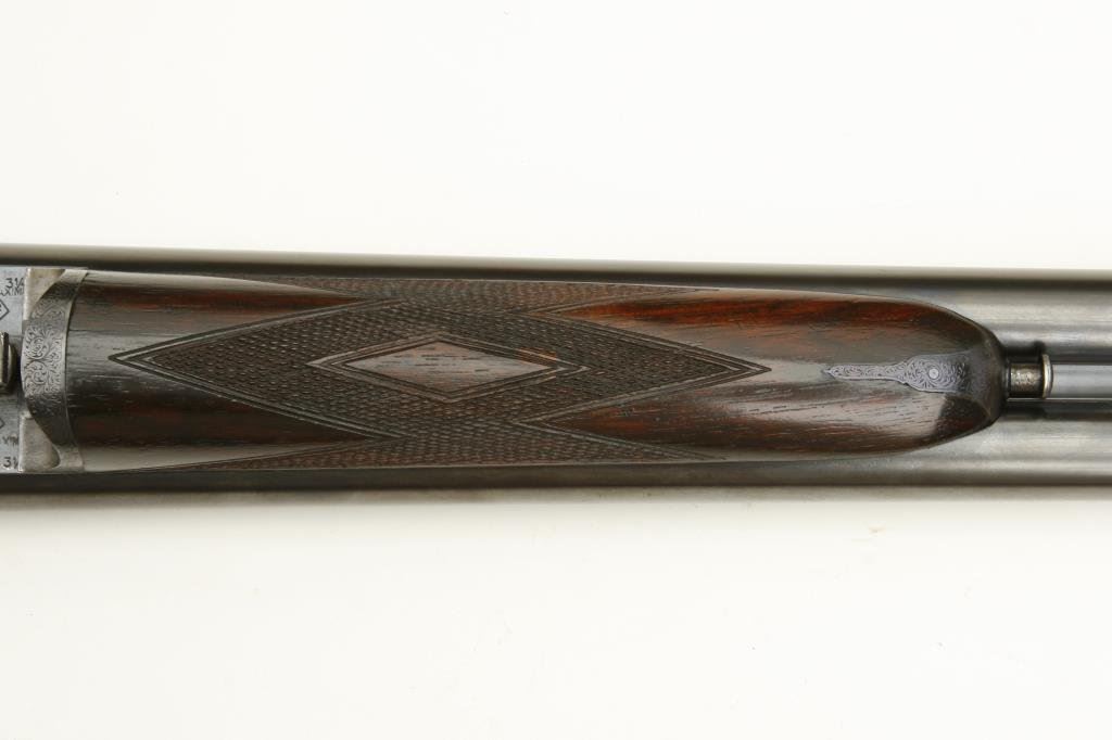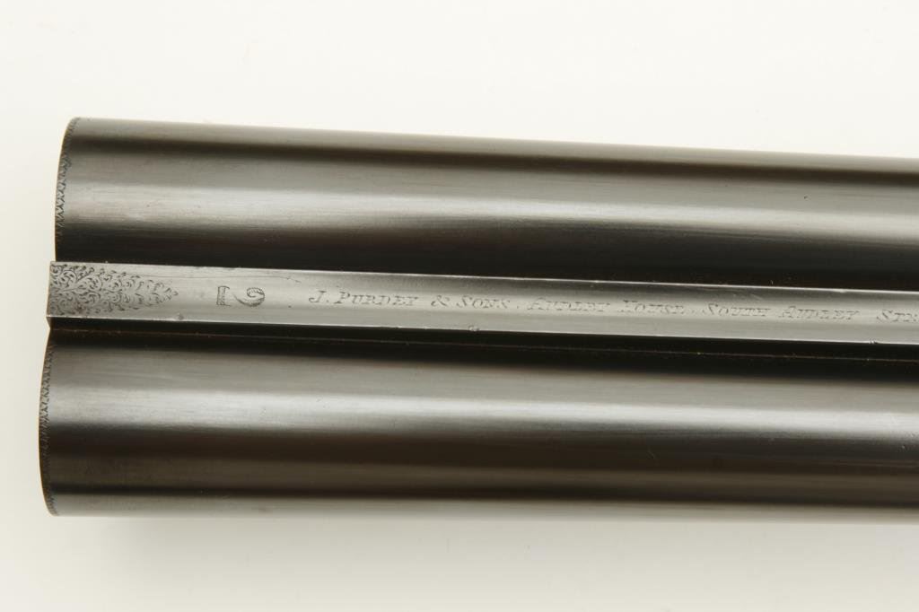 30” barrels, auto ejectors, 2 ¾” chambers, S/N 17720 and originally built 1902-05. Copies of letters and bills from Purdey confirms return to the factory for refinishing, lengthening of chamber, and re-proof circa 1978. Currently shows 1978 nitro proof for 1 1/8 oz. shot also self-opening, straight stock without pistol grip, splinter fore end, floral and scroll best quality engraved with British style heel plate. Letters also confirm restocking and change from pistol grip to straight. The condition is fine to excellent as factory re-built and refinished. The length of pull is 14 ½” to front trigger, drop is 1 ½” at comb and 2 ½” at heel. Choked cylinder and improved cylinder. The barrel thickness are “In range”. Also a Purdey motor case with label in lid included. Approximately 80000 to replace at current rates and a very nice gun showing modern proofing and factory restoration. (C&R) Est.: $12,500-$25,000