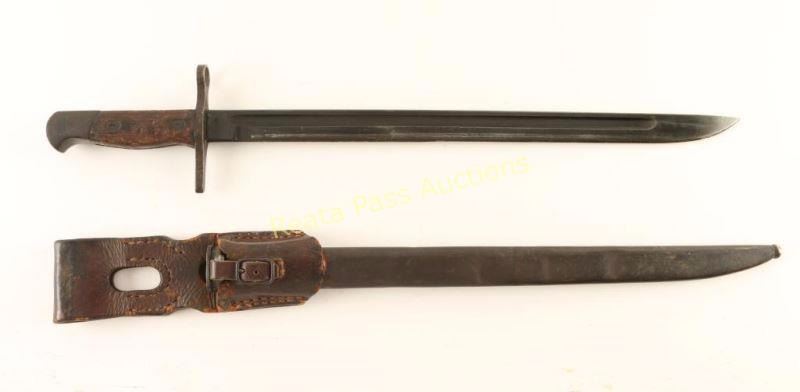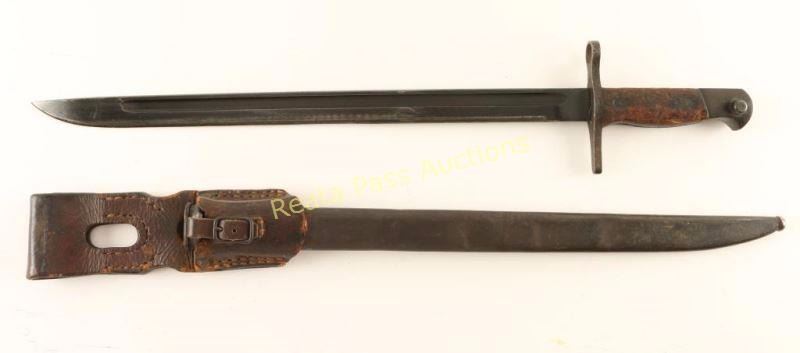 #10 All Metal Construction Wood Handle Serial #93997 20 1/2" Overall With A 15" Blade And Metal Sheath With Leather Hanger.