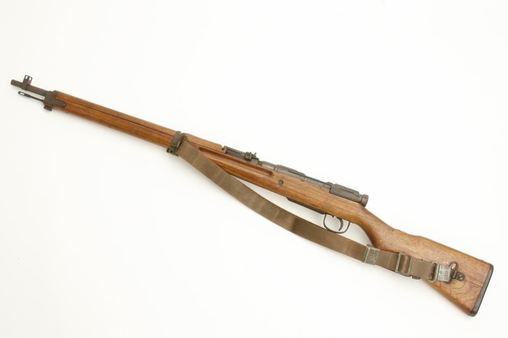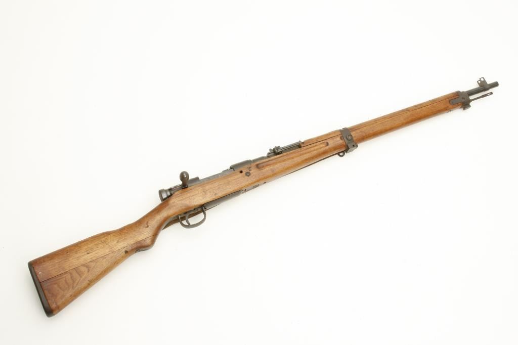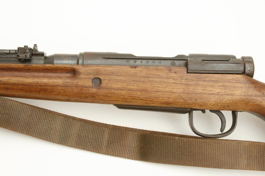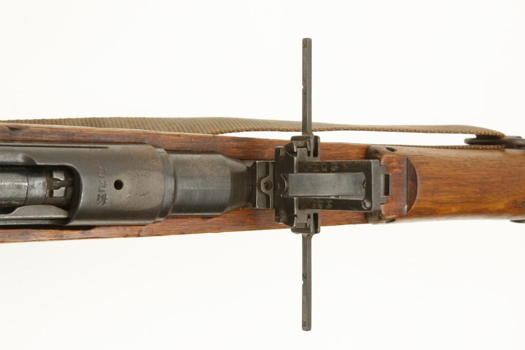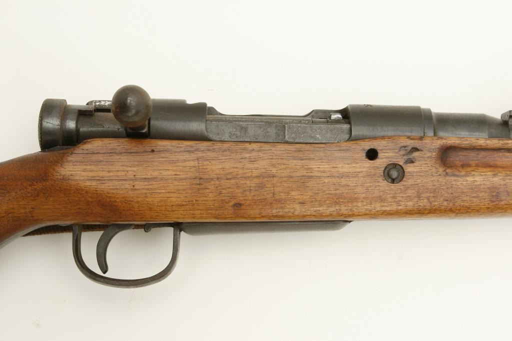 serial #24621. The rifle is in good overall condition with a 26” barrel. The barrel retains the majority of its military finish and the rear tangent sight has its aircraft wings. The receiver shows significant original military finish with light surface rust noted. The mum has been ground off the rifle’s front ring. The smooth wood stocks are in good condition showing moderate use with mars and compressions with original sling swivels retained. The butt stock ends with a smooth metal butt plate with moderate surface rust. The bore is good, the action crisp and the markings are legible. The rifle includes a military style canvas sling. (C+R) Est.: $100-$200.
