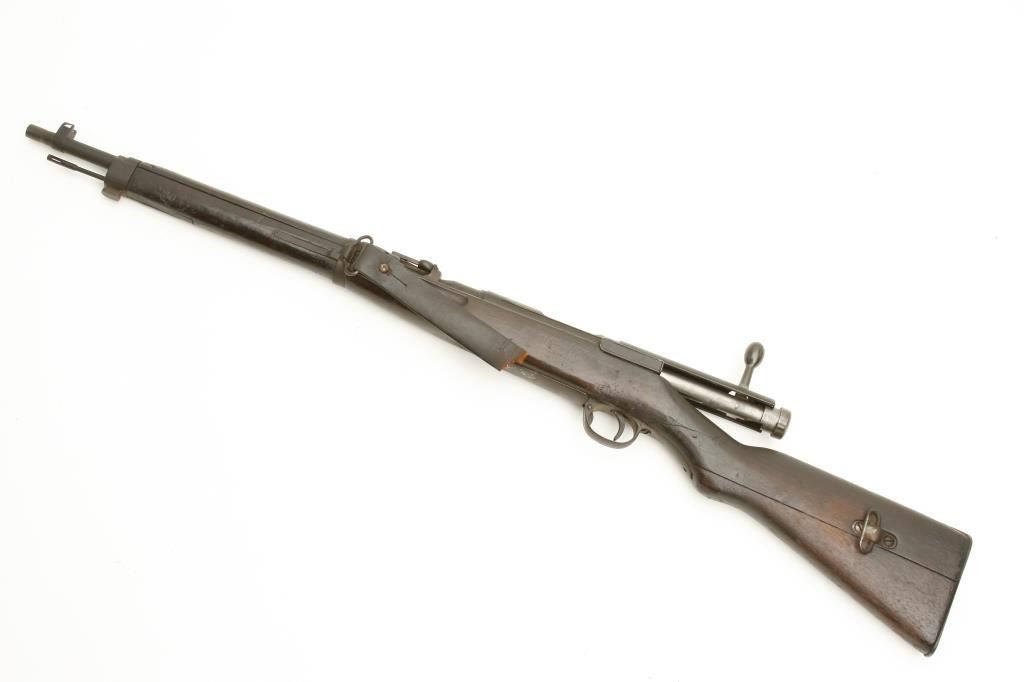The carbine is in fair overall condition with a 20” barrel. The barrel has gone to a dark brown patina with the mum on the front ring of the receiver being dark but clearly visible. The receiver is a dark brown patina with signs of heavy use. The smooth wood stock is in fair condition showing heavy use with dents, compressions and lateral cracks in the butt stock. The butt stock ends with a smooth metal butt plate and includes sling swivels and a piece of an old leather sling. The bore is poor with pitting and erosion evident the length of the barrel. The action would not function at the time of description and should be checked by a competent gunsmith. (C+R) Est.: $200-$400.