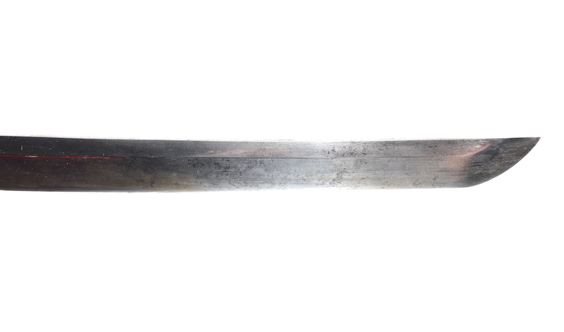 Japanese army officers sword and scabbard. Blade single edge slightly curved with cascading wave Hamon temper line probably Gunome zigzag style. Gunto mounts to tsuba and Kashira. Ray skin grip with brown wrapped cotton over. Menuki matching to mounts. Size 37 1/4" L, blade 25 3/4" L, Not Signed. Condition: Loss to scabbard lacquer, scabbard missing endcap with crack at end. Other wear from age and use.. Provenance: Ex-Los Angeles Estate