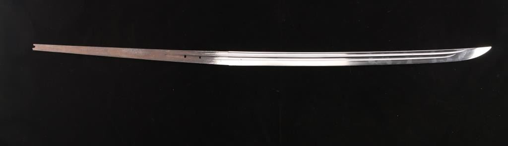 Original 23 2/4" Futasuji-hi (Double Bo-hi) blade with two identical and parallel grooves. Long tang with 40" overall length. No signature is visible on the tang, has surface rust. Two holes above the blade and one at the top, the top has a small section broken off. Blade is bright with some scratches, some dark patina, pitting on the top edge near the point and a very small nick on the sharpe edge near the point. Has the dimensions for a Nagamaki sword.
