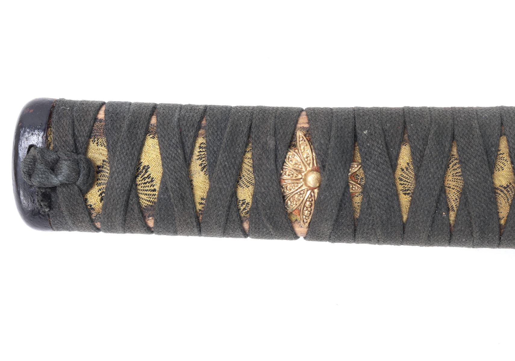 Old Japanese Katana sword with red painted scabbard. Single edge curved blade with Hiro Suguha?. Hamon temper line. Handle with silk wrapping and gilt copper menuki. Black cotton wrapping over. Solid iron tsuba. Size 29 3/4" L, Blade 27 1/4" L, Signed. Condition: Minor wear to the scabbard, so corrosion on the blade as seen. Provenance: Ex-Southern California Estate