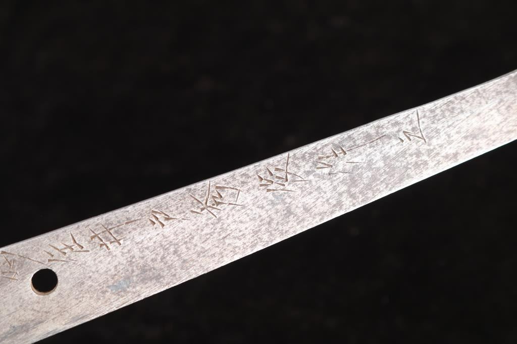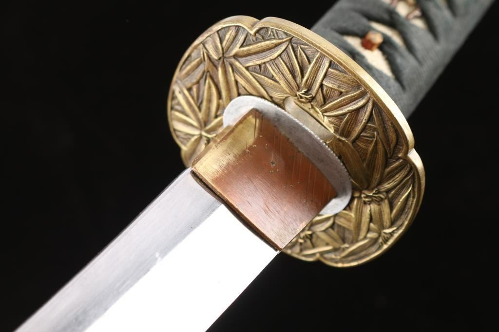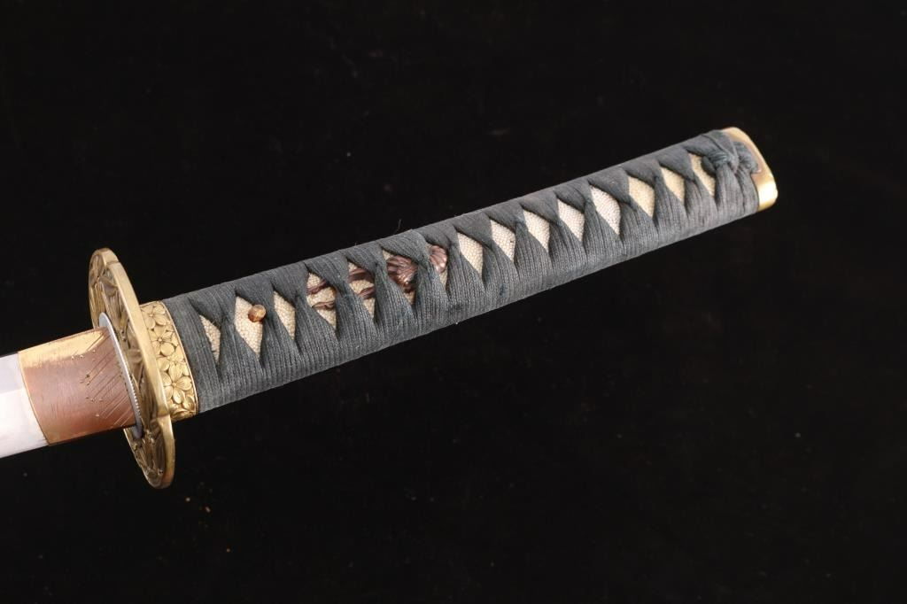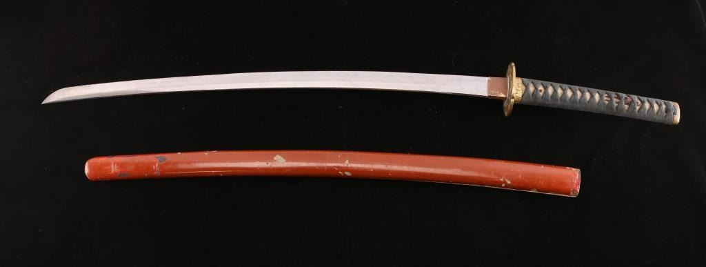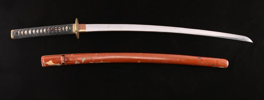 Believe mid Edo period. 26" long point blade, the temper line (Hamon) is clearly visible, and is of the wavy O-Notare (large, sweeping waves) type. Ray skin wrapped grip, black cloth wrapped with spiny lobster menuki, often called ebi in Japanese, represent longevity and prosperity. Furthermore, the lobster's hard shell and spiny appearance also suggest a resemblance to samurai armor, making it a fitting and auspicious design for sword fittings. The top of the brass colored alloy Kashira (pommel), Fuchi (collar) and the scabbard feature cherry blossom motifs. The brass colored alloy solid Tsuba, Mokko Gata shape, is decorated with with plants. The one hole tang is signed on both sides The wood orange lacquered scabbard is missing the fitting and there is some separation near the top of the two sides.