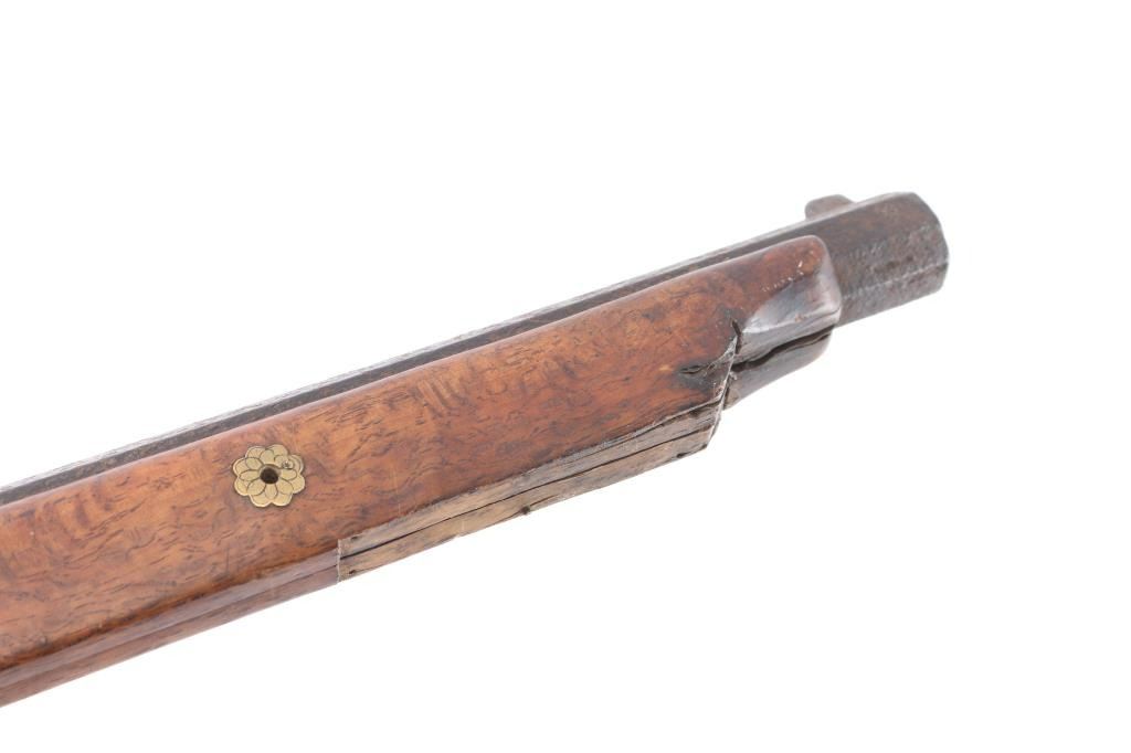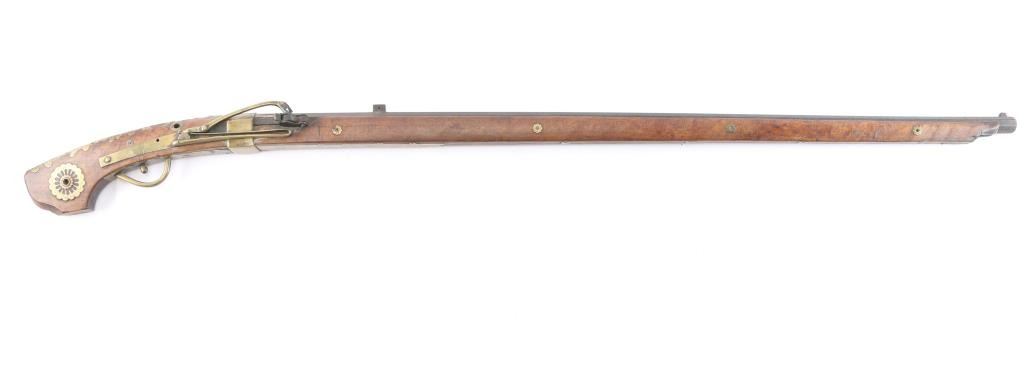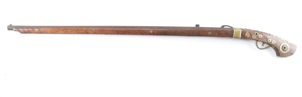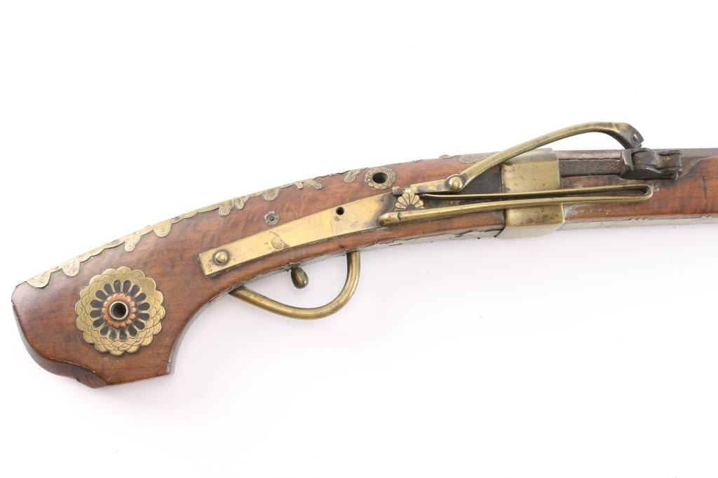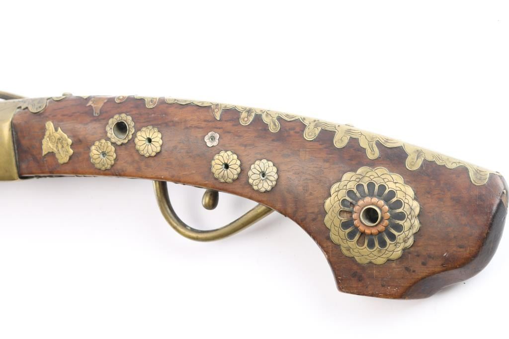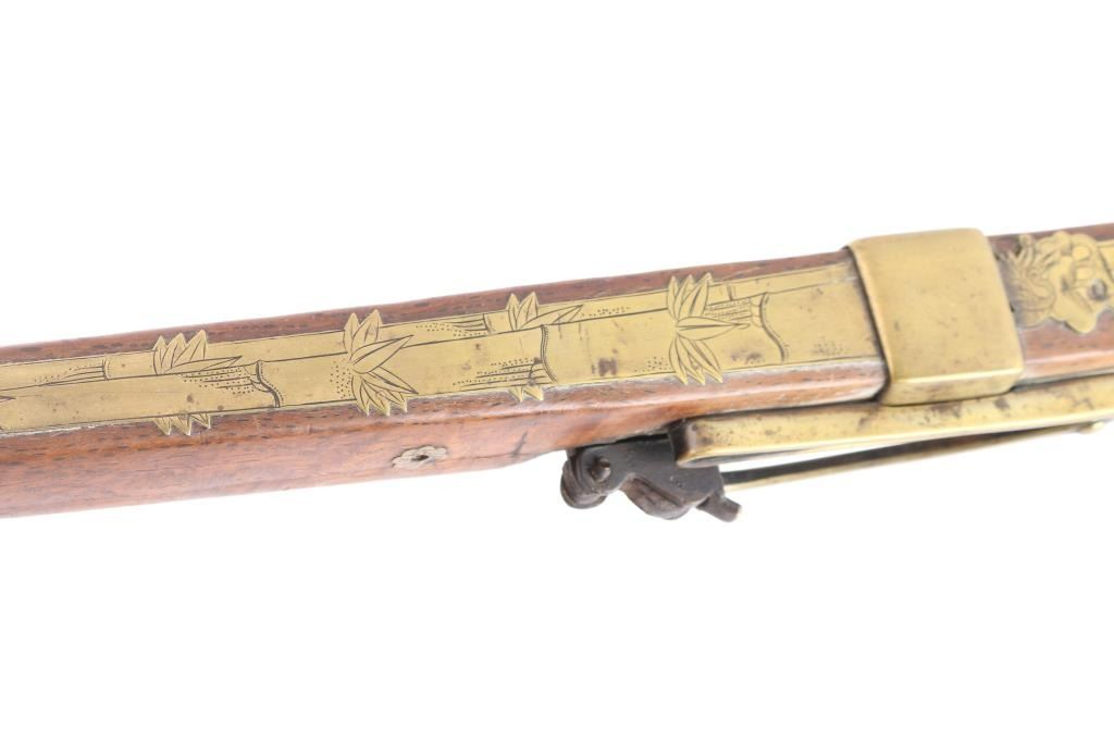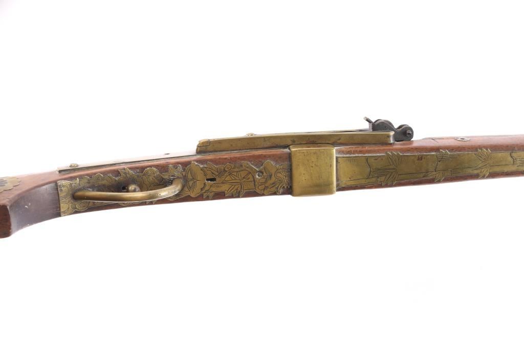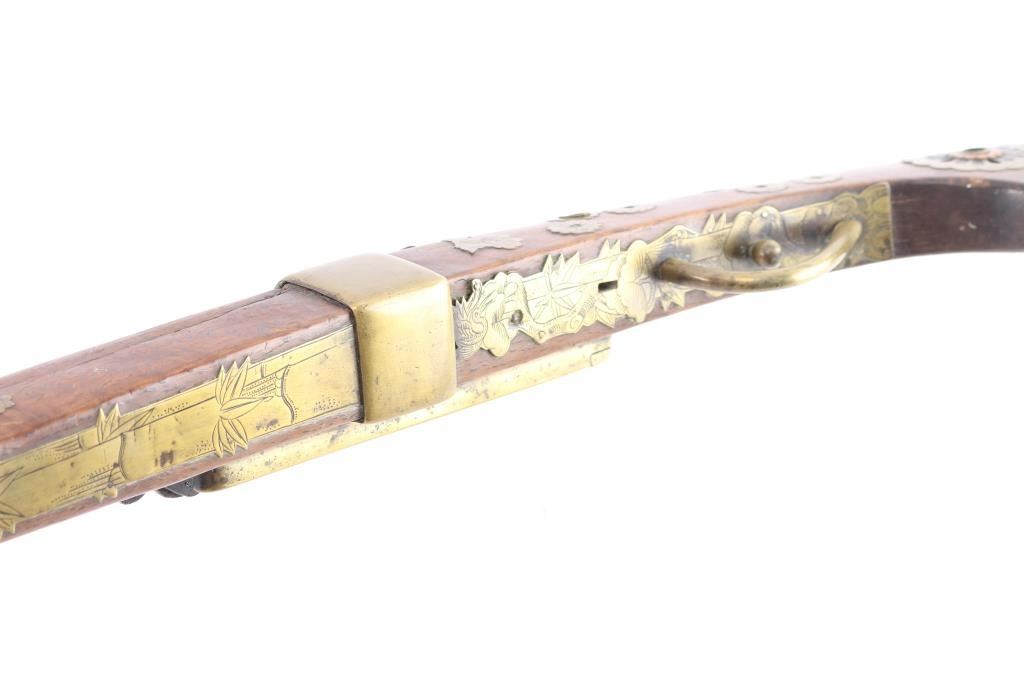Antique Japanese Tanegashima long matchlock rifle. About .50 bore. Early to mid 19th century. Used primarily by the samurai class and their ashigaru (foot soldiers), 39" smooth bore octagonal cast iron barrel with inverted V front sight and a slotted iron block rear sight. A bag/box with a variety of separate sight pieces, apertures that were inserted in slots. The wood stock, which was rested against the cheek, is extensively inlaid with engraved brass panels and decorated plaques. No family "MON". The escutcheons for the barrel pins are cherry blossoms, with three small birds in flight on the underside and there are inlaid animal, floral designs as well as a samurais face wearing a kabuto behind the chamber. There are large brass/copper flowers on the butt stock, surrounding holes in the stock, which apparently were used to direct the excess match lock wick through the stock and out of the user's way. The Hajiki Gane (Spring on lock) has a Chrysanthemum symbol. The matchlock action is all brass, complete with hinged pan cover and serpentine hammer or fuse holder. The trigger is also brass of button form protected by a simple brass bow trigger guard. The rifle has some condition issues as follows, no ramrod, missing a brass rivet from the lock plate, missing the hammer clamp, missing a small escutcheon on the top wrist, the barrel is pitted, stock has a long hairline crack on the underside, two hairline cracks in the wood in front of the chamber, missing 3" brass plate on the underside of the fore stock and the lever that releases the serpentine is short/broken. The trigger works well. Needs some restoration or would make a nice display piece.