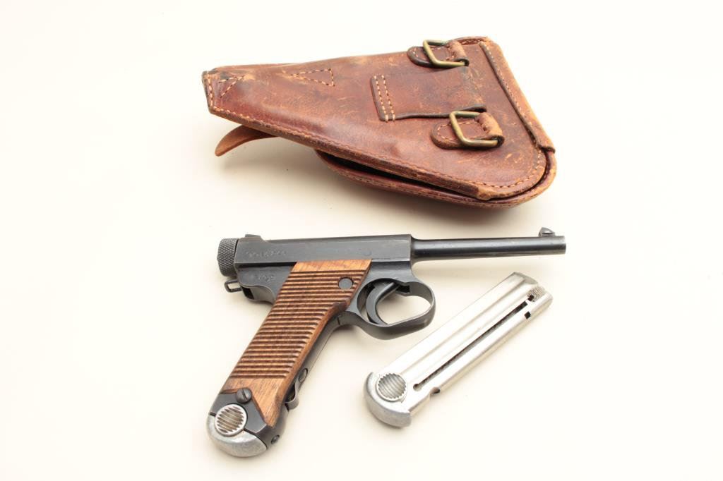 finish, wood grips, S/N 18245 with matching magazine and one extra non-matching magazine; accompanied by a leather clamshell holster. The gun is in overall very good + condition displaying the majority of its military finish, very good bore, crisp action, sharp markings and very good grips. (C&R/PPT). Est.: $500-$1,000.