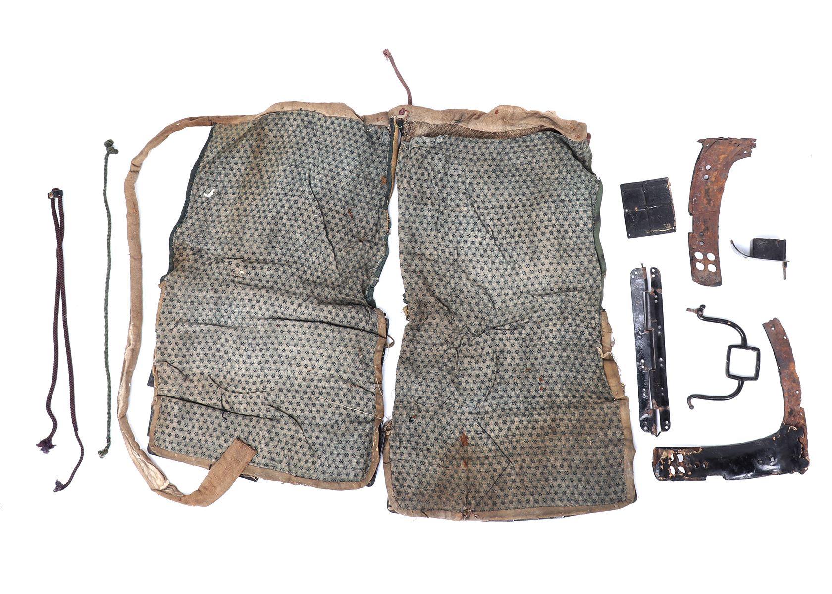 Japanese Samurai armour thigh protection and breastplate components. The thigh protection with some missing lames but otherwise attached to the padded linen and cotton backing. Do or cuirass armour components for the breastplate and backplate including the hinged section and shoulder or under arm lames for a black lacquer armour. Size largest 19 1/4" H x 19" W. Condition: Wear commensurate with age throughout.