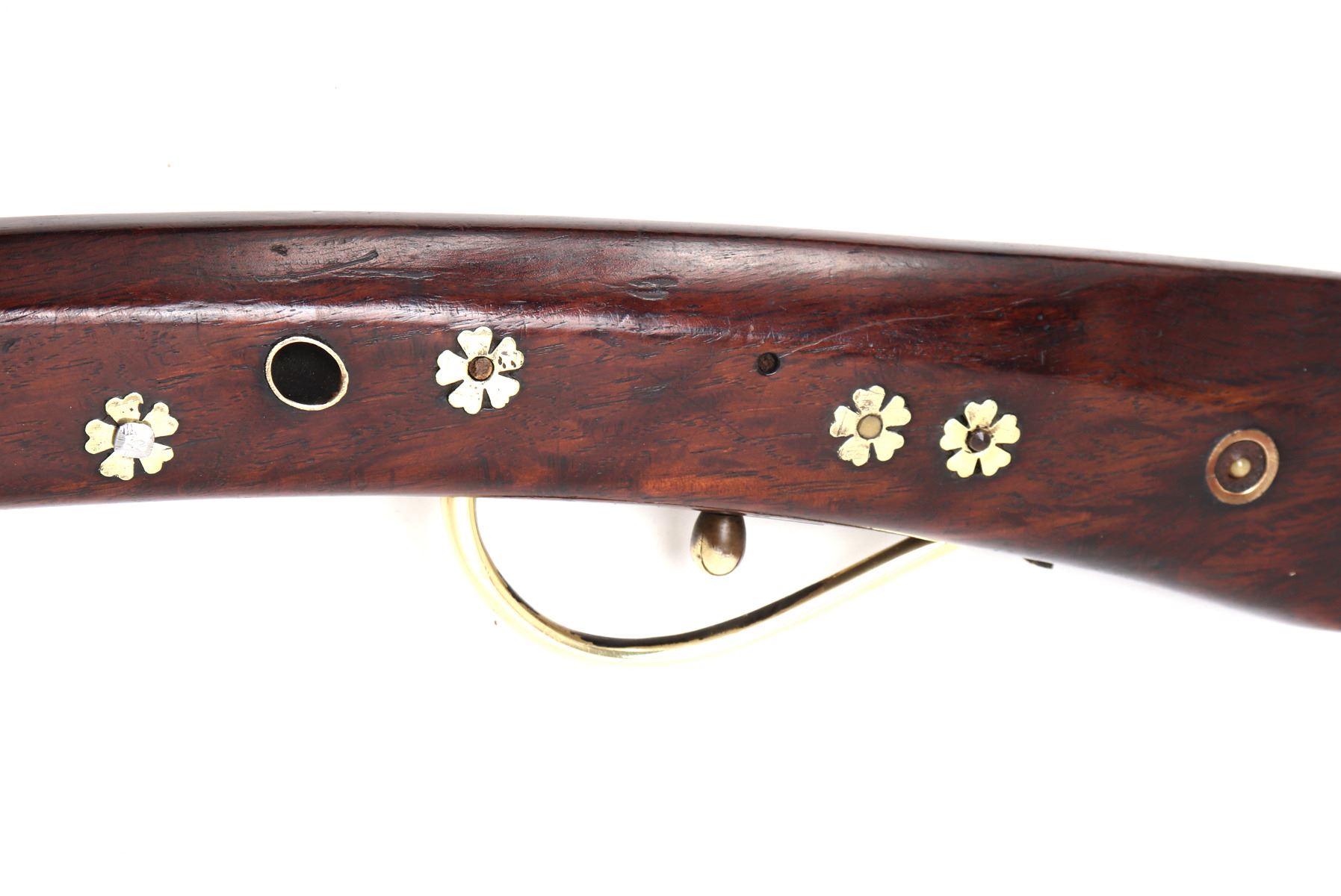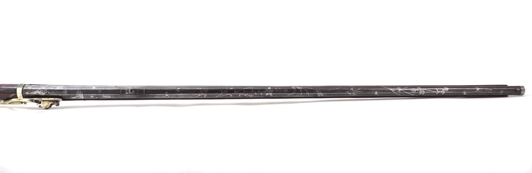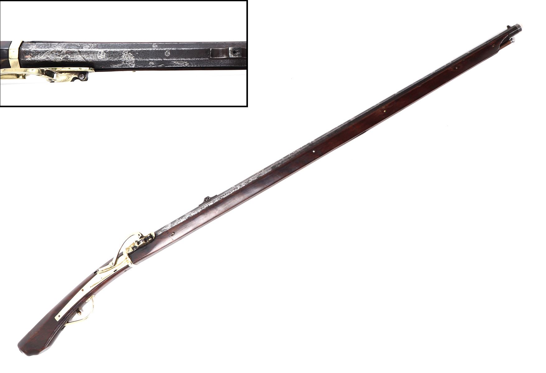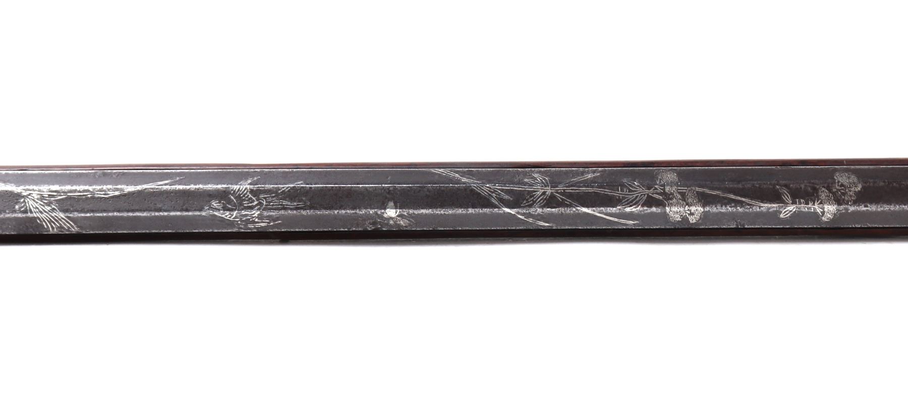 Antique Japanese Tanegashima matchlock rifle, 18th century with later restoration. Barrel original, octagonal and silver inlaid. Forward sight to barrel with silver inlaid key fret pattern to muzzle the remainder covered in large patterns of floral motifs and birds all in silver. Matchlock mechanism with rebuilt spring and hammer and original brass receiving tray to barrel. Stock in a fine brown wood inlaid with brass floral motifs and inlays. Size 50 1/2" L, barrel 34 1/4" L. Provenance: Ex-Southern California Collection