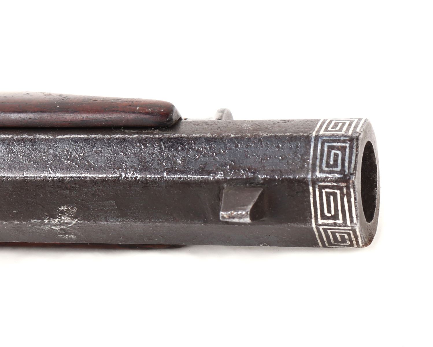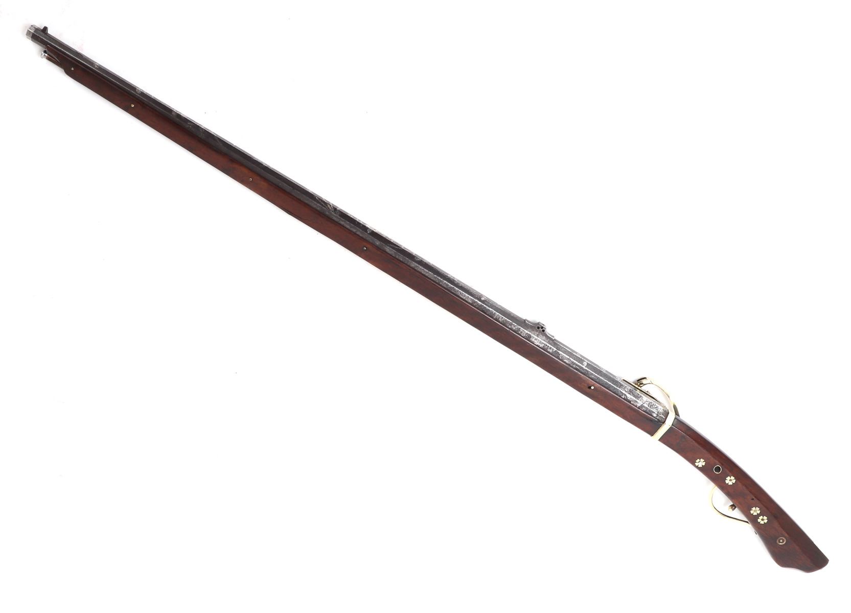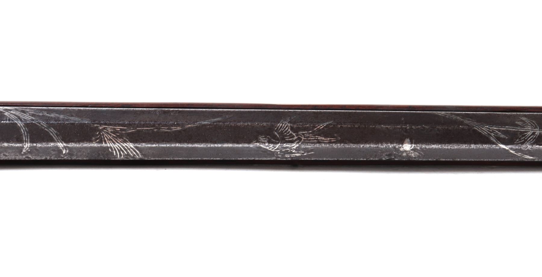 Antique Japanese Tanegashima matchlock rifle, 18th century with later restoration. Barrel original, octagonal and silver inlaid. Forward sight to barrel with silver inlaid key fret pattern to muzzle the remainder covered in large patterns of floral motifs and birds all in silver. Matchlock mechanism with rebuilt spring and hammer and original brass receiving tray to barrel. Stock in a fine brown wood inlaid with brass floral motifs and inlays. Size 50 1/2" L, barrel 34 1/4" L. Provenance: Ex-Southern California Collection