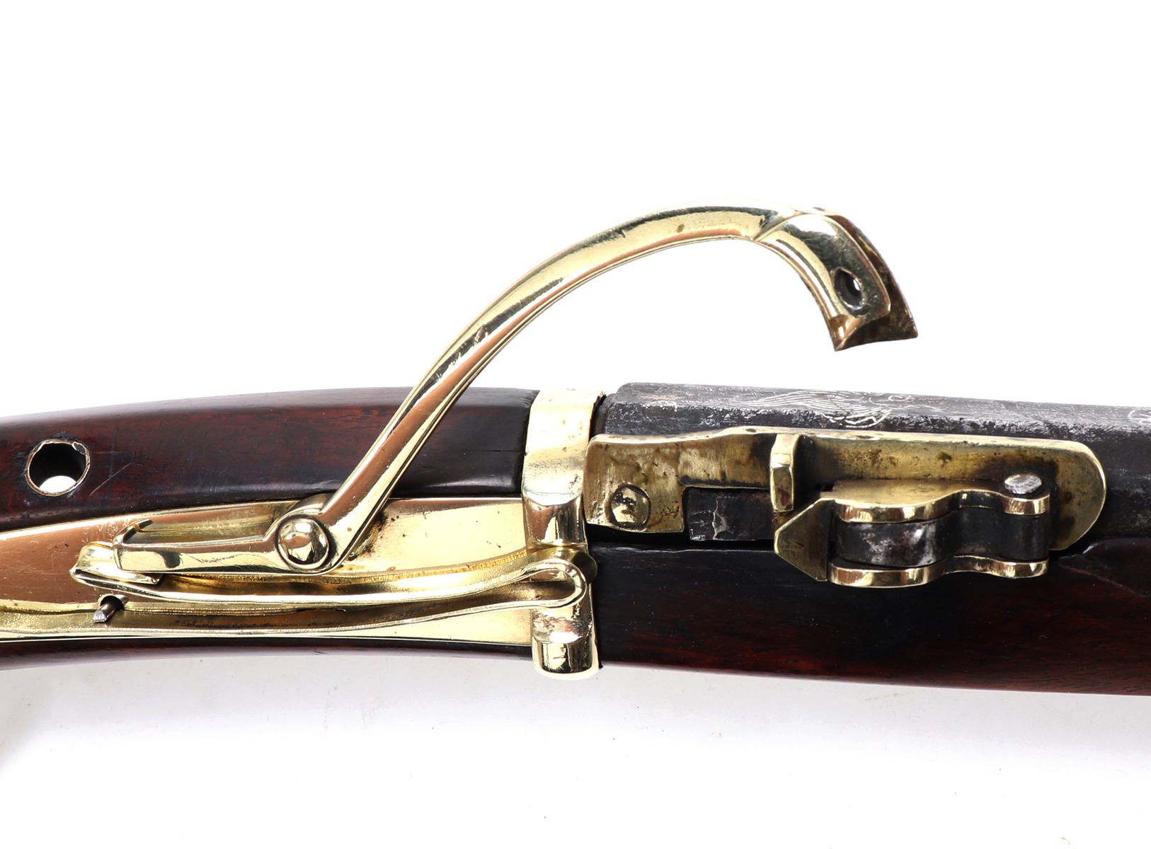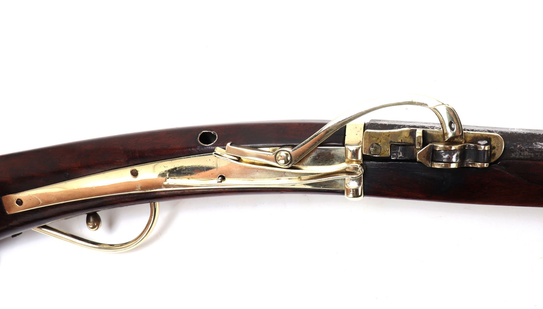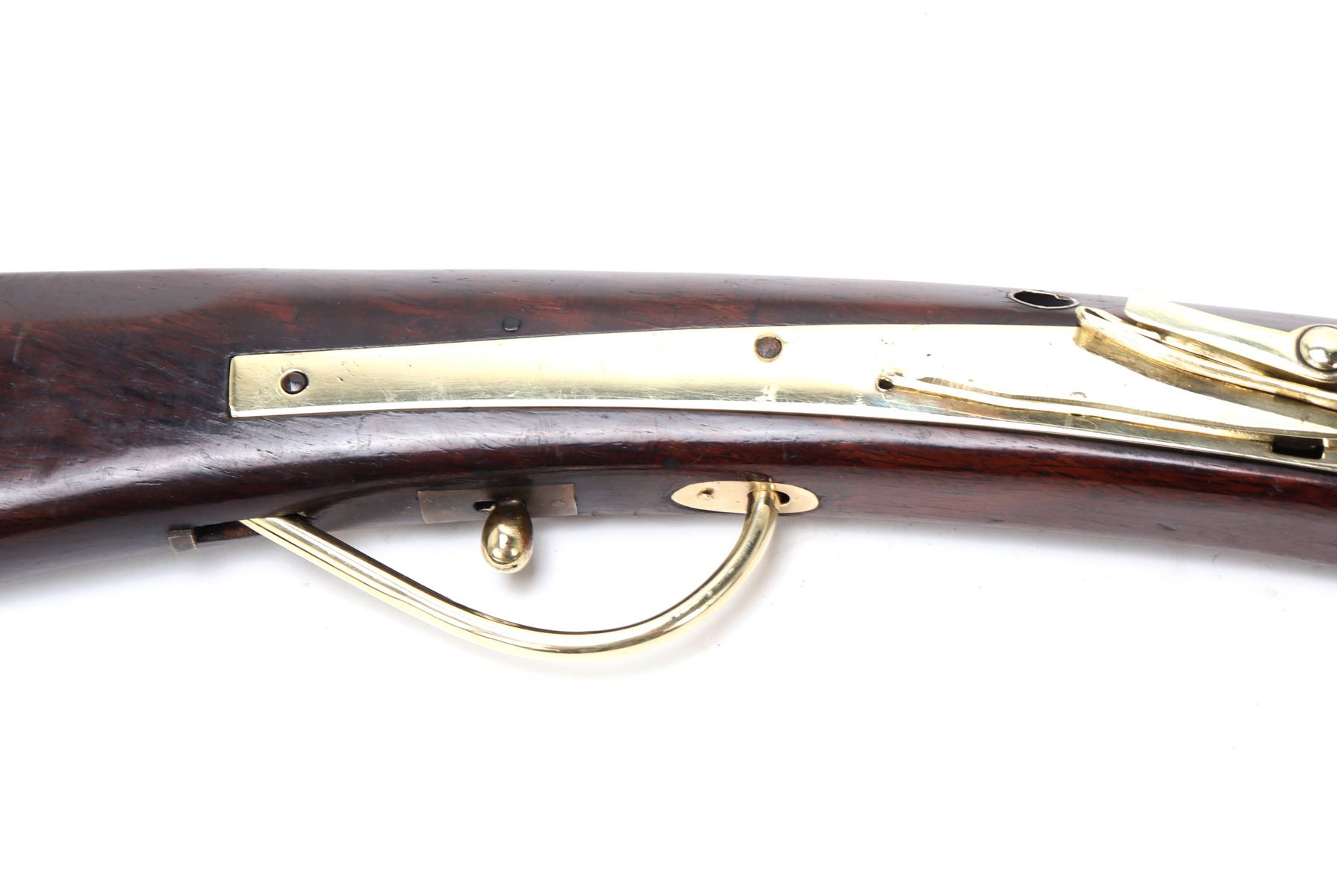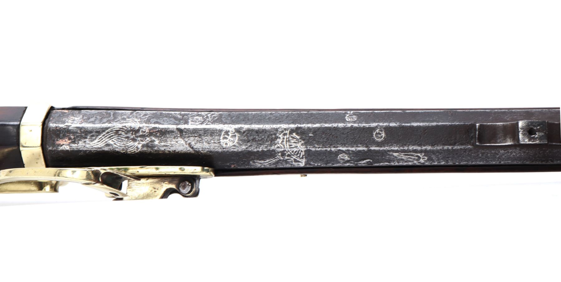 Antique Japanese Tanegashima matchlock rifle, 18th century with later restoration. Barrel original, octagonal and silver inlaid. Forward sight to barrel with silver inlaid key fret pattern to muzzle the remainder covered in large patterns of floral motifs and birds all in silver. Matchlock mechanism with rebuilt spring and hammer and original brass receiving tray to barrel. Stock in a fine brown wood inlaid with brass floral motifs and inlays. Size 50 1/2" L, barrel 34 1/4" L. Provenance: Ex-Southern California Collection