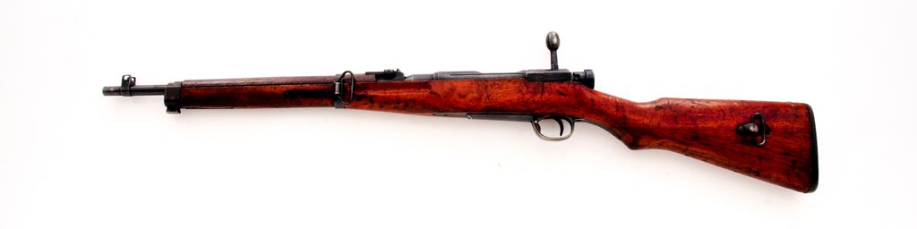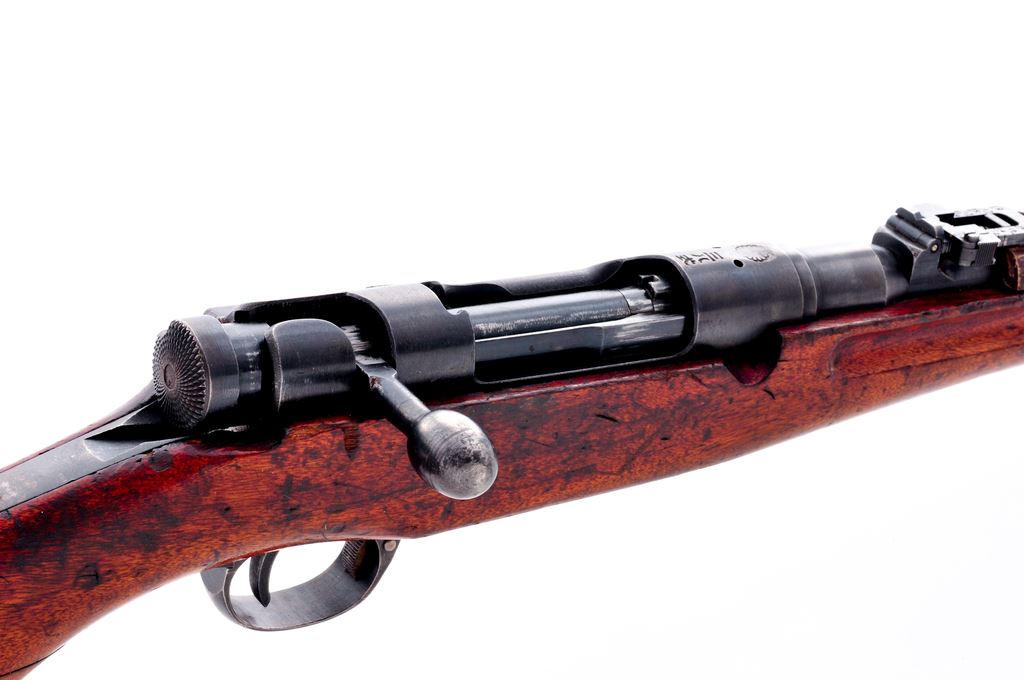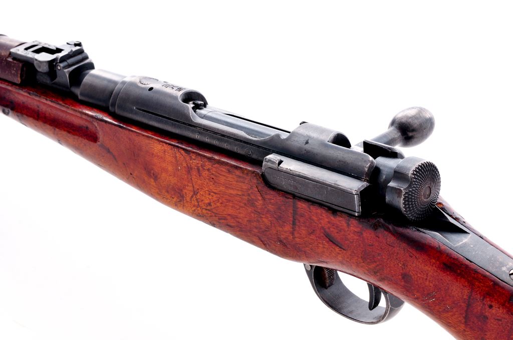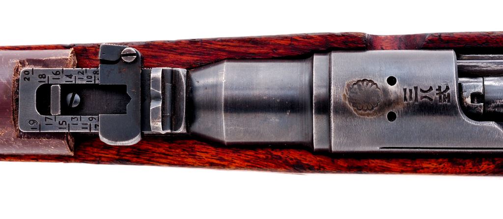 Japanese Type 38 Arisaka Bolt Action Carbine, #71066, 6.5 Japanese cal., 19'' barrel, blued finish, hardwood stock, inverted ''V'' front sight with guards and adjustable folding leaf rear sight. Stamped on receiver ring with partially removed Imperial crest over Japanese characters for ''Type 38''. Matching number on bolt handle, mismatched number on bayonet lug. Missing cleaning rod. Condition overall is very good. Area around crest shows applied cold bluing, otherwise the metal retains over 80% finish with rust on the buttplate. Handguard is a plastic replacement. Stock has an even slightly dark color with overall handling marks. Action is smooth, bore is bright with good rifling. Est.: $150-$300. (C&R)