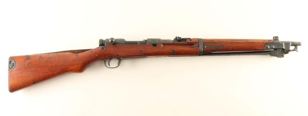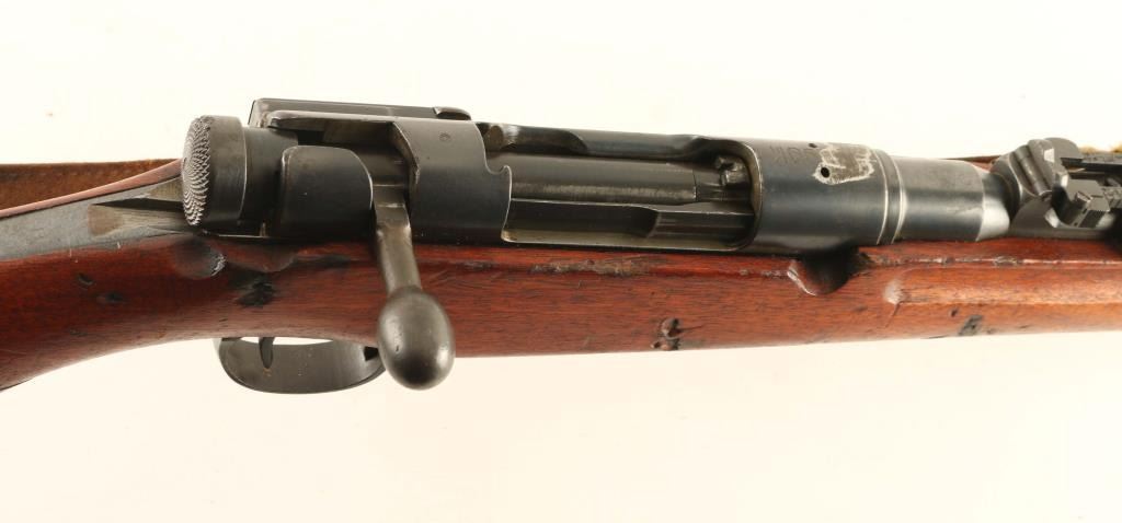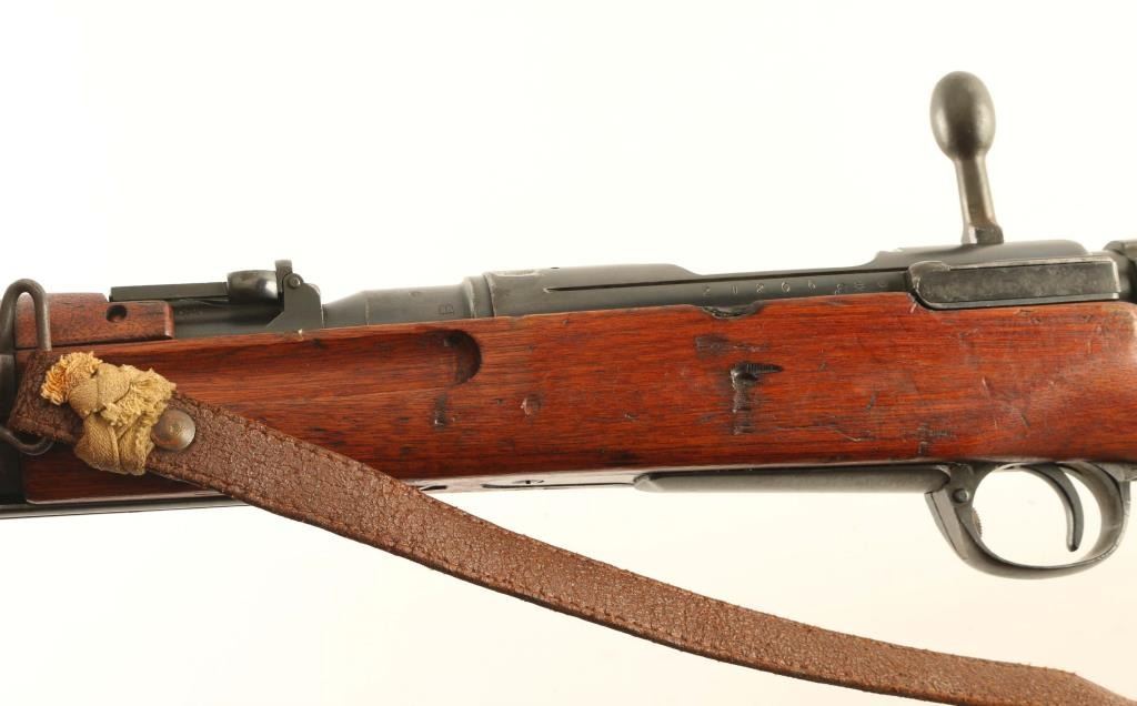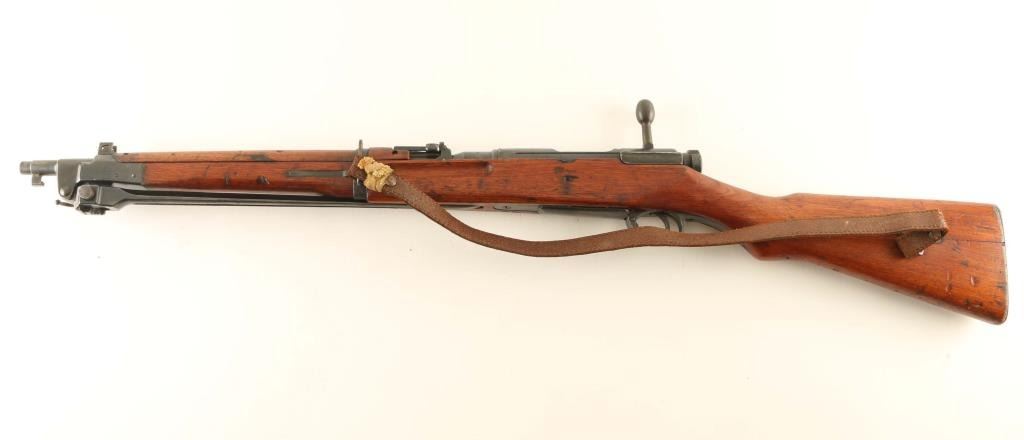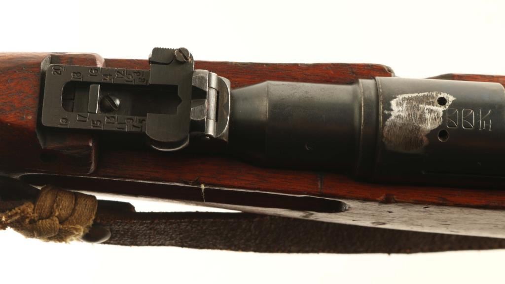 Japanese military carbine features approx 19" barrel, straight bolt handle, military sights, folding bayonet (appears to be type 2 mount block), sliding door butt trap for cleaning rod (rod sections absent), hinged floorplate, side mount sling swivels. Bore is good condition, some frosting, strong rifling. Retains 85% blued finish, some pitting on ejector box, bare metal showing at sharp edges and where Mum is ground off. Stock is in very good condition, with dents and dings, appears to be original finish. Non matching bolt. No import marks observed. Includes fair condition 7/8" wide leather sling. Condition is NRA Very Good *** C&R Firearm ***
