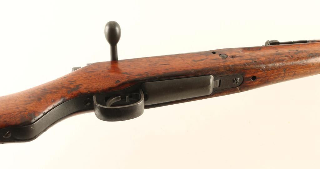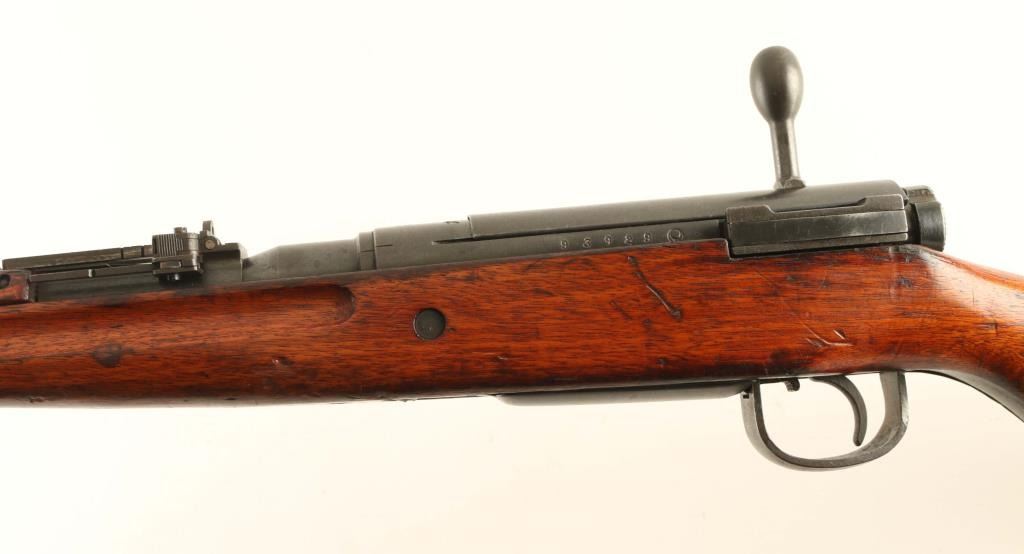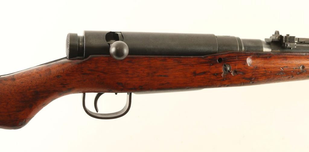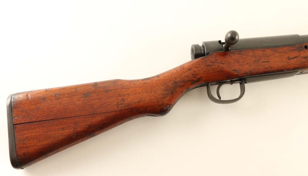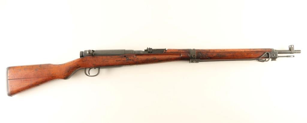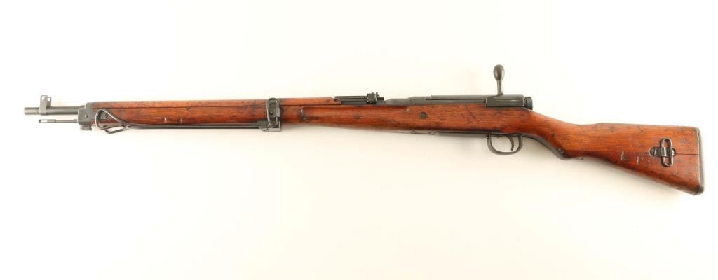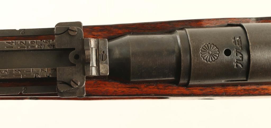 Japanese military rifle features approx 25" barrel, straight bolt handle, military sights with anti-aircraft wings, bayonet lug, cleaning rod under barrel, hinged floorplate, folding monopod, sliding dust cover. Side mounted sling swivels. Bore appears good to very good, should improve with cleaning due to hard chrome lined bore. Retains 85% blued finish, thinning and turning gray at bolt handle and bottom metal, with partial ring of bare metal near muzzle from bayonet mounting. Stock is good or better condition, many dings and small gouges, appears to be original finish. Slight gp present at dovetail join. Mum is intact. All observed numbers match, including dust cover. No import marks observed. Attributed as a GI bring back (no papers). Nagoya manufacture, no series character. Condition is NRA Very Good *** C&R Firearm ***
