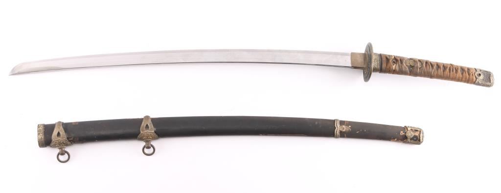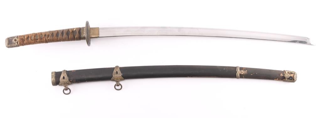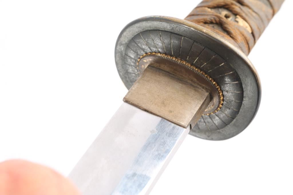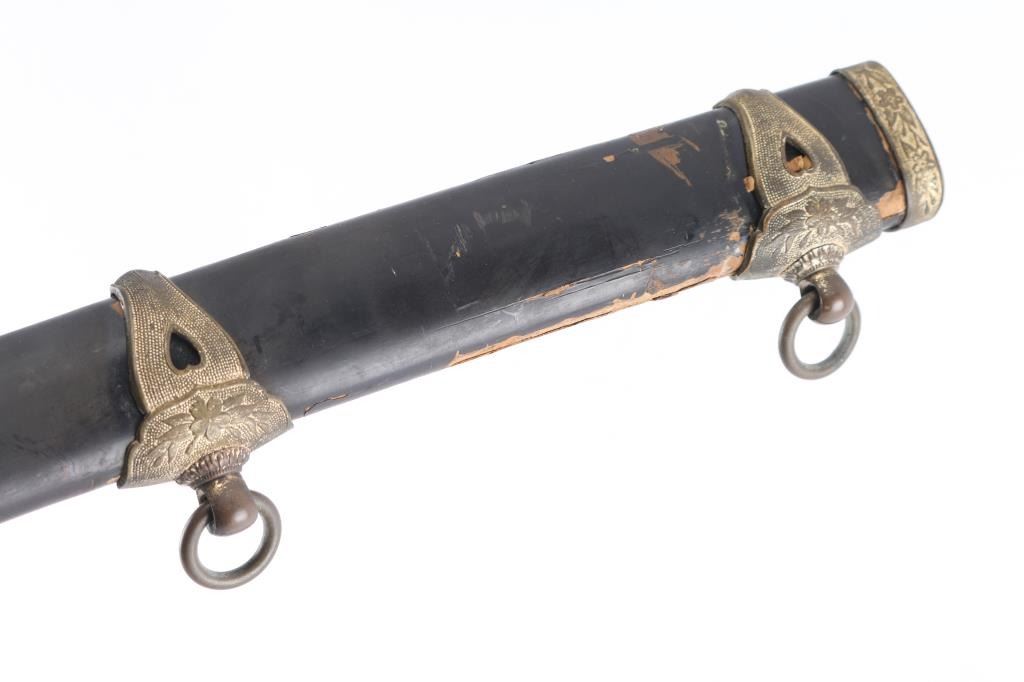 Japanese Naval Officer's Kai-gunto type 97 sword with Shinogi Zukuri blade shape, lacquered black scabbard with gilt brass metal mounts. The 26 1/4" blade retains most of the original factory finish, with a simulated temper line. Heavy brass tsuba (cross guard) and the large brass Seppa (spacers) and O-Seppa (Large spacers) around the tsuba are large and highly stylized. The tsuka (handle) has two gold highlighted Cherry-Blossom menuki (grip decorations), and a nice gold highlighted Kabuto-Gane (End Cap), the wooden securing peg missing, sharkskin wrapped grip with complete brown-colored Ito (cloth binding) with fine decorative collar. The sharkskin has dried out and has crazing. There also is oxidation on the various metal fittings. As typical of the pattern, Cherry Blossom motifs appear on many of the fittings. The handle is tight to the blade, with secure spacers.The crossguard, tang, fuchi, tsuka, tsuba and all 4 of the spacers are marked with western number "864", indicating an original matched set made for this specific blade. The tang has no anchor but is arsenal signed. The scabbard is scuffed. These navy swords are somewhat rare as most of them wound up on the bottom of the ocean.
