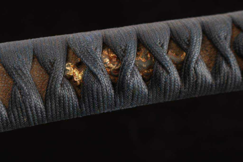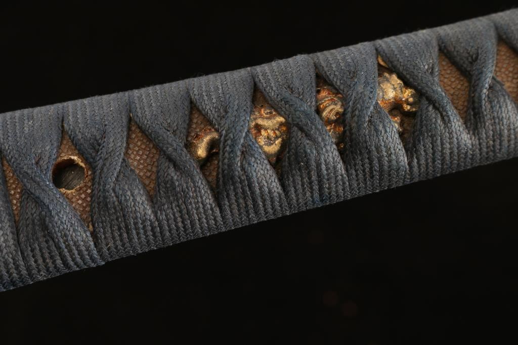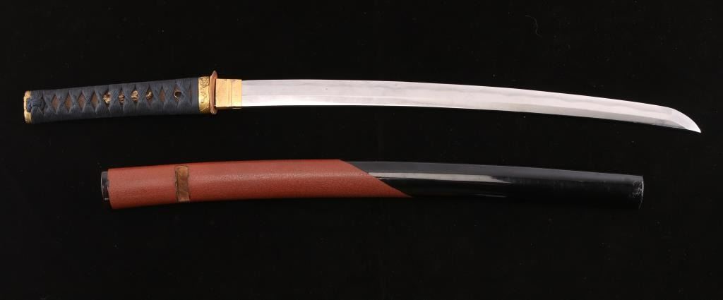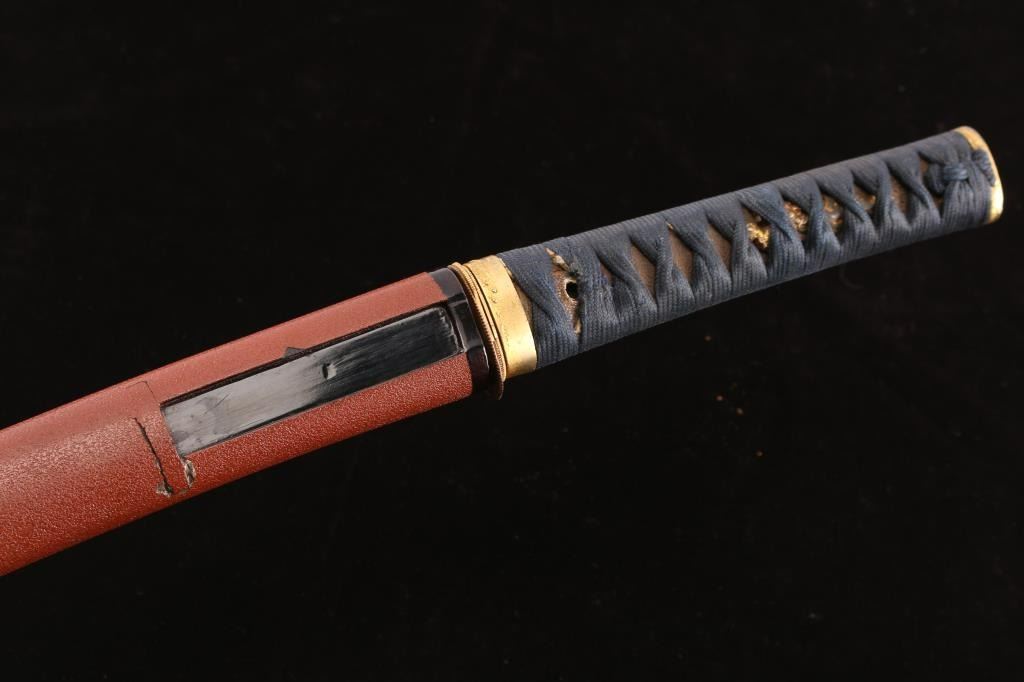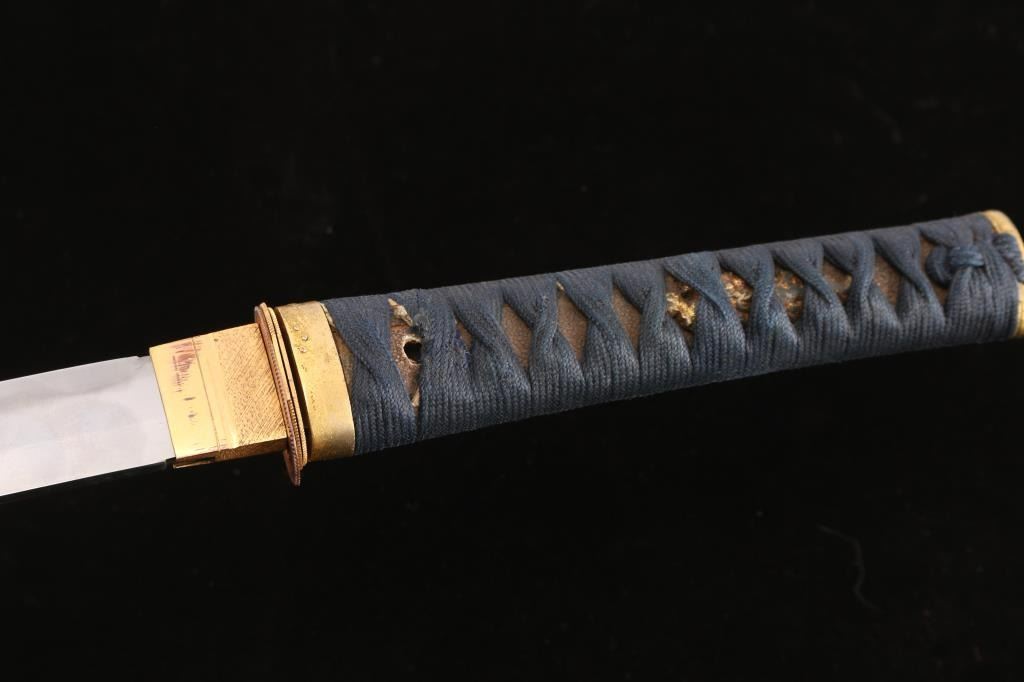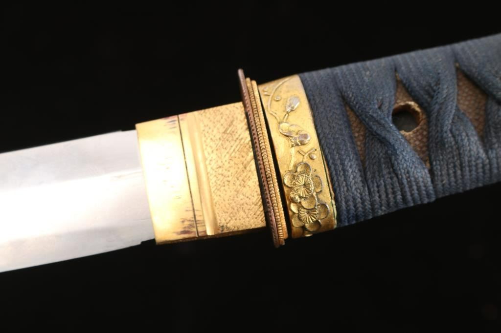 The top of the Kashima (pommel) features an depiction of a bird in flight with cherry blossoms, the Fuchi (collar) dipicts cherry blossoms. 19" blade with wavy tempered line. The blade’s Nakago (tang) has one Mekugi-Ana (peg hole). Ray skin hilt with indigo blue cloth wrapping. Samurai valued indigo-dyed blue cloth not only for its perceived protective and healing properties but also for its symbolic associations with loyalty, wisdom, tranquility, and victory the Menuki appear to be a octopus (Hard to see with the wrap). Missing the Tsuba, has three spacers. Two toned black/brown scabbard, inletted for Kozuka knife which is missing. Tang is unsigned. Overall very good condition, blade is bright with some minor scratches. Would be a really nice Wakizashi with correct Tusuba and Kozuka..