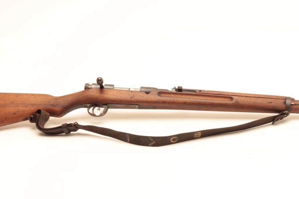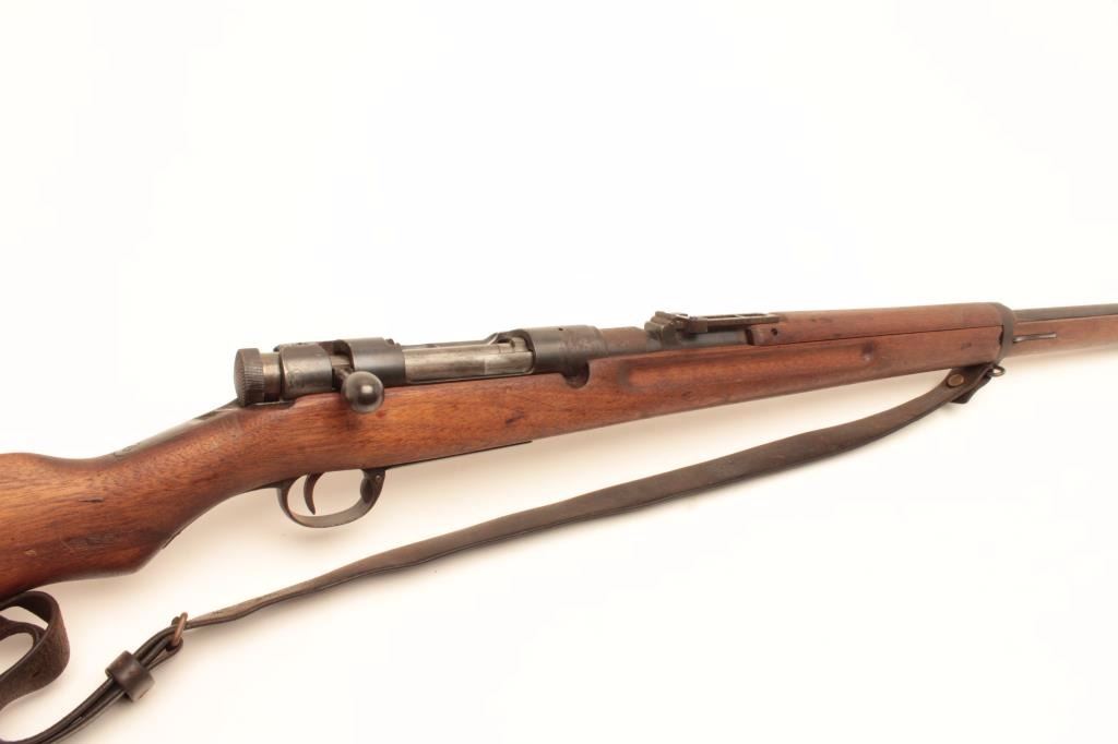 Japanese bolt action Arisaka rifle, 6.5mm caliber, 31.5” barrel, military finish, wood stock, leather sling, S/N 882777, visible mum and Japanese characters, in overall fair to good condition with some areas of surfacerust, dark bore, good action, overall good wood; consignor note on gun states “unsafe to shoot” (possibly related to action or bolt); have checked out by competent gunsmith as with all used firearms. (C&R).Est.: $100-$200.
